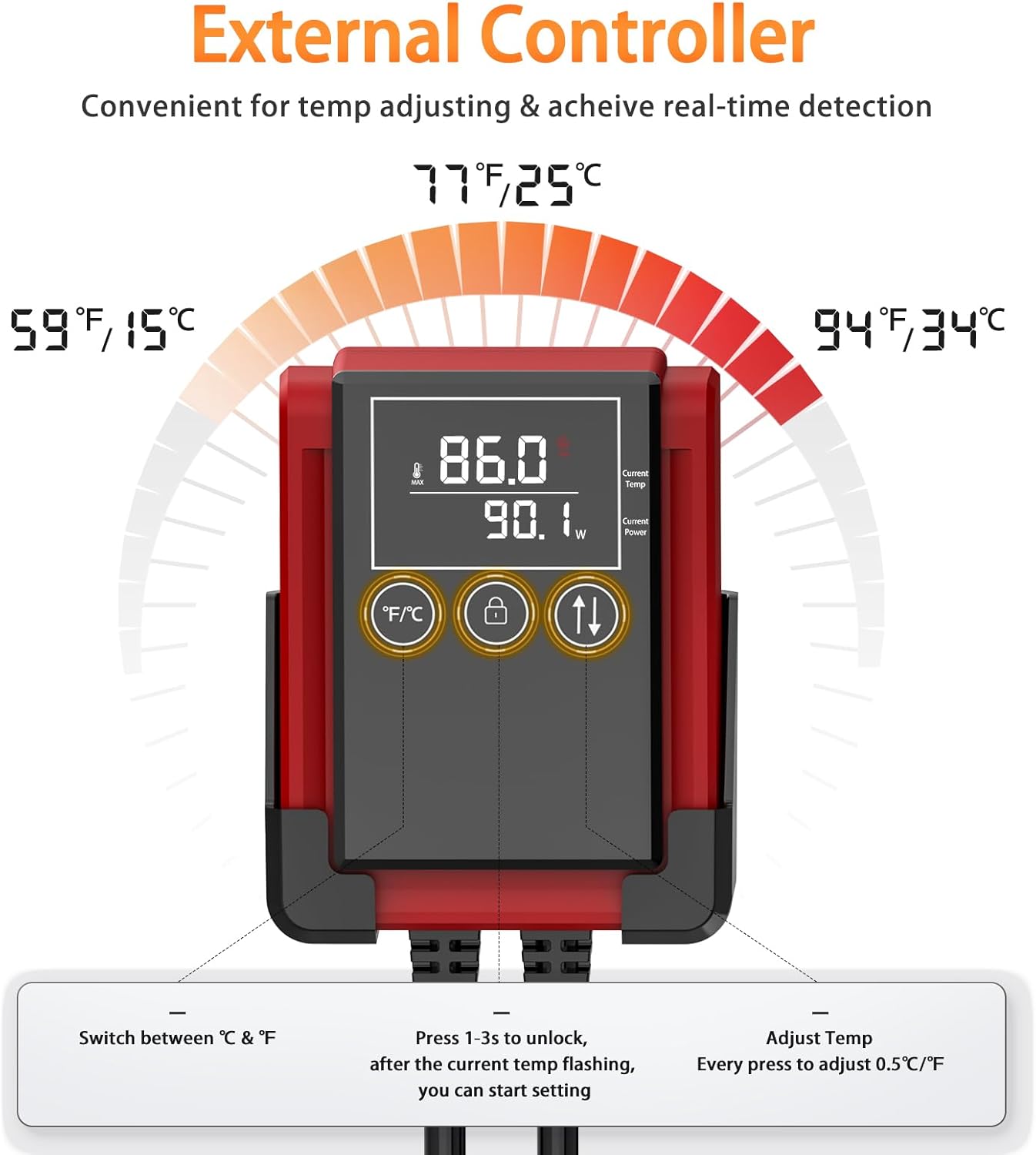 Easy & Safe Operation: You can set the temp with an external controller; Long press the child lock button for 1-3s to enter the temp setting state, then press the temp cycle button, every press to adjust 0.5°F/°C, the available set temp range is 59°F-94°F (15°C-34°C); After stopping operating the controller for 3s, the fish tank heater will automatically enter the child lock state, which prevents children from accidentally touching
