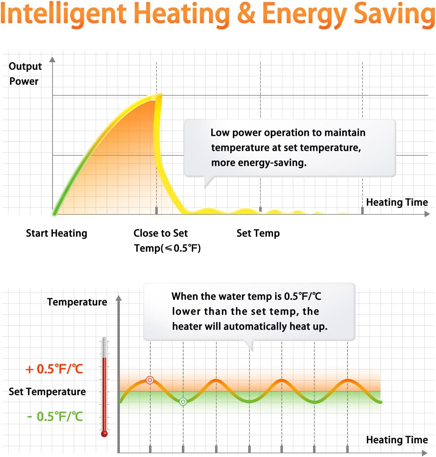 Intelligent Heating & Energy-Saving: AQQA fish tank heater adopts automatic constant temperature heating, when the water temperature is lower than the set temperature, it will automatically warm up. When the water temperature reaches the set temperature, the heater will run at low power to maintain the water temperature within 0.5℉ difference from the set temperature; AQQA aquarium heater can reduce your electricity bill by 45% compared with traditional heaters