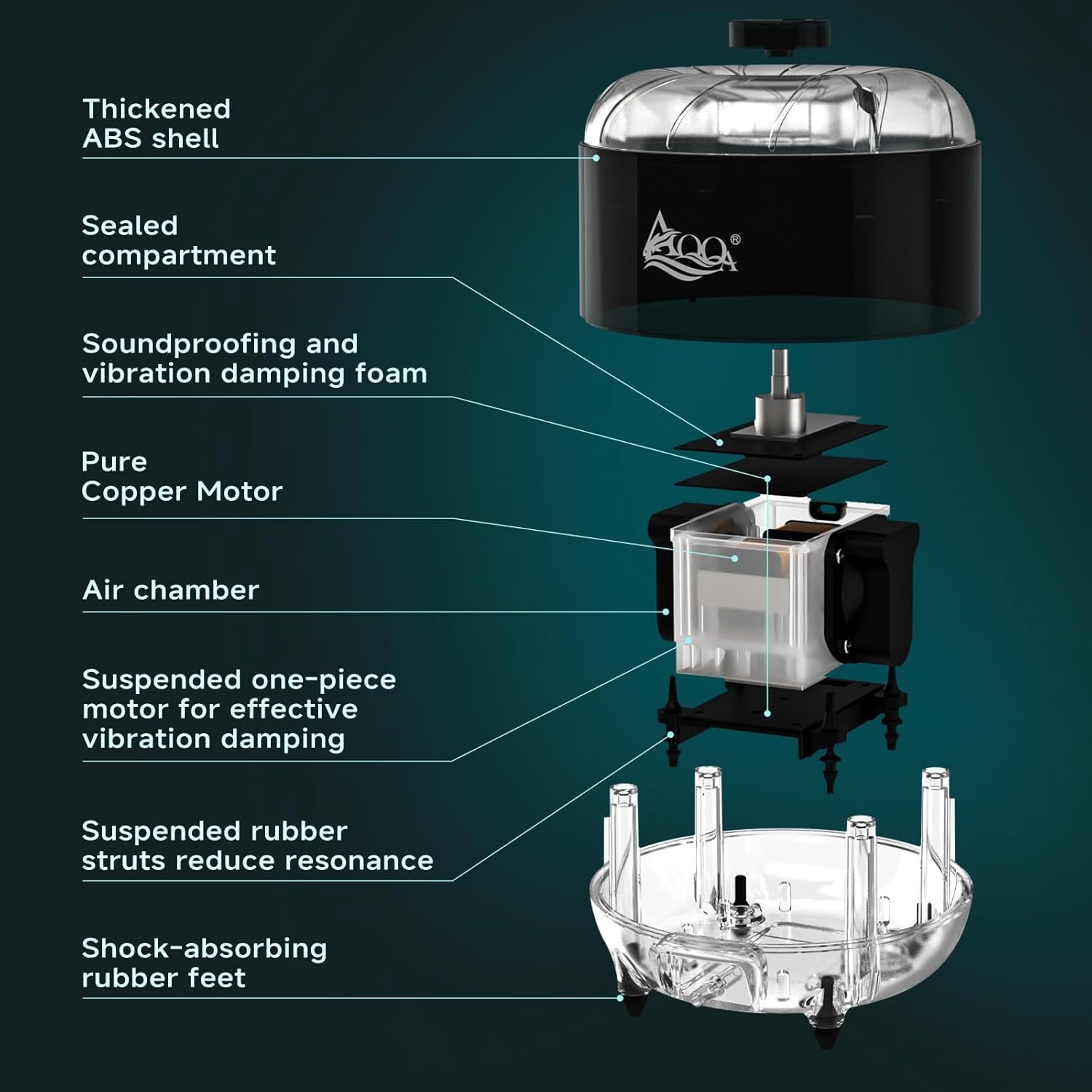 Ultra-silent Air Pump: This pump is driven by a suspended double duplex air chamber, ensuring strong airflow and reduced friction reduces noise; Rubber feet on the bottom to reduce vibration transmission; All-in-one space-capsule pump body effective noise insulation; Less than 35 dB of noise when in use