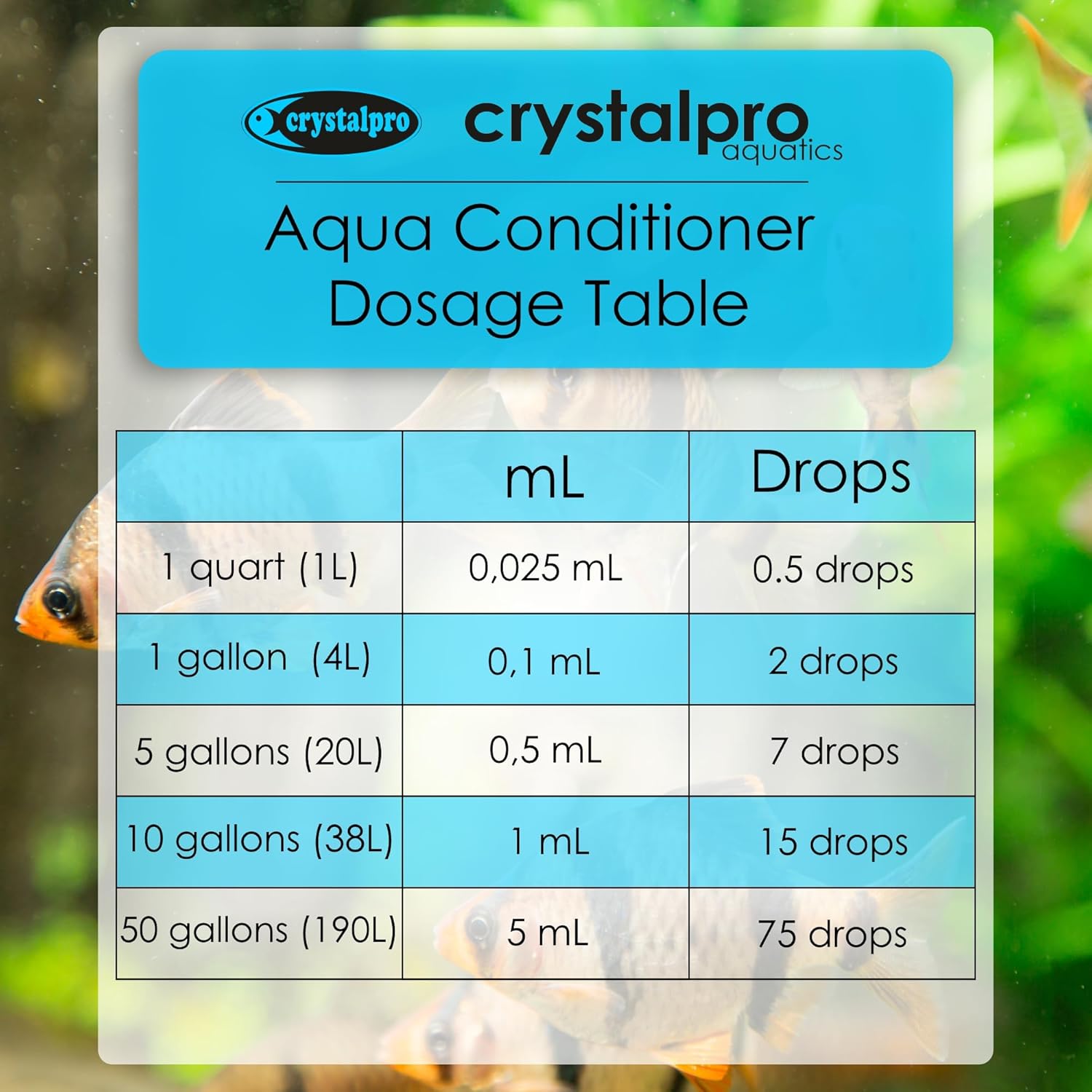 Crystalpro Aqua Conditioner neutralizes harmful substances that can come from tap and well water. Turns tap water into safe aquarium water.
