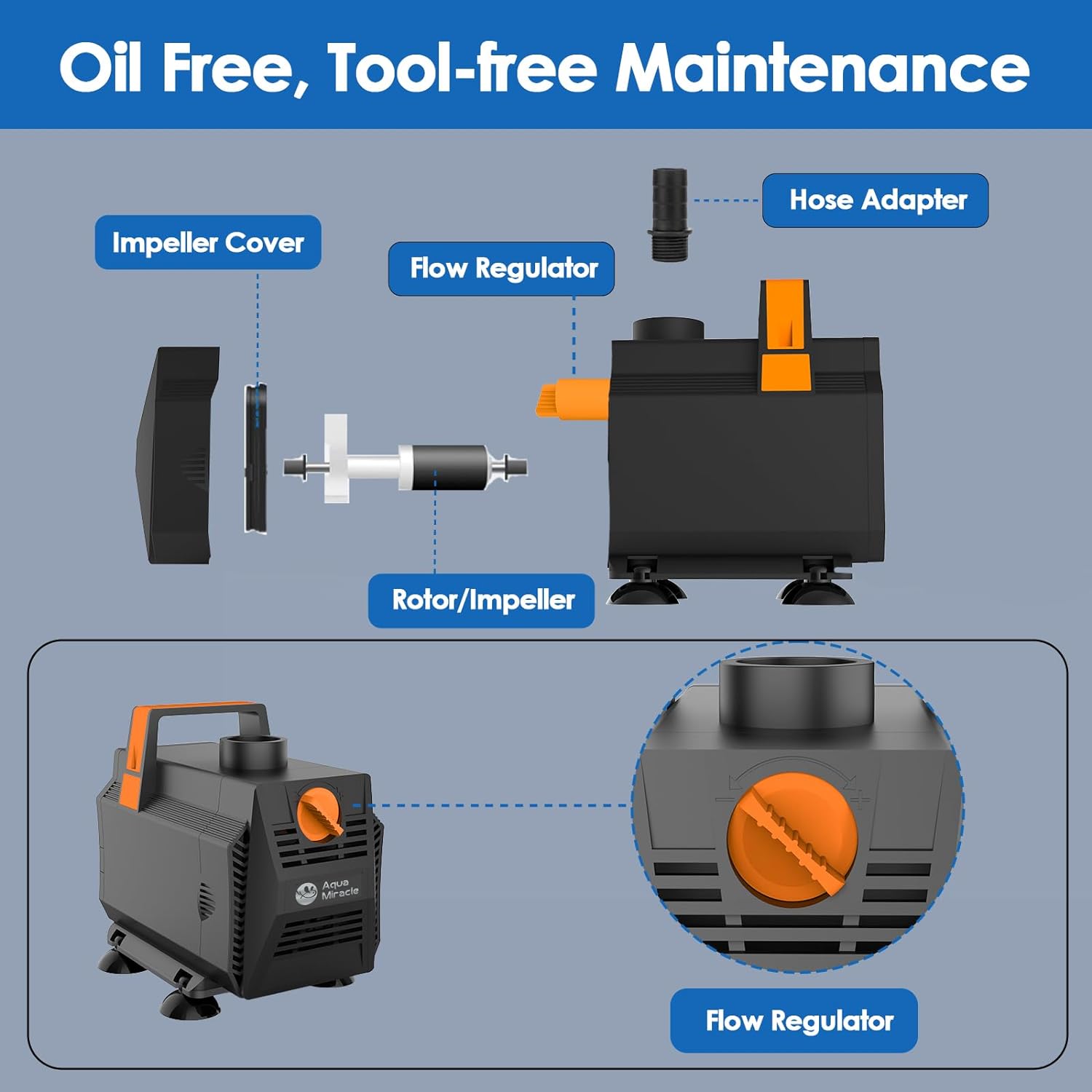CONVENIENT MAINTENANCE – Designed with a handle for portability, this fountain pump is user-friendly. Maintenance is hassle-free with no lubrication required and no special tools needed. Simply detach the front screen, rinse the components, and reassemble.