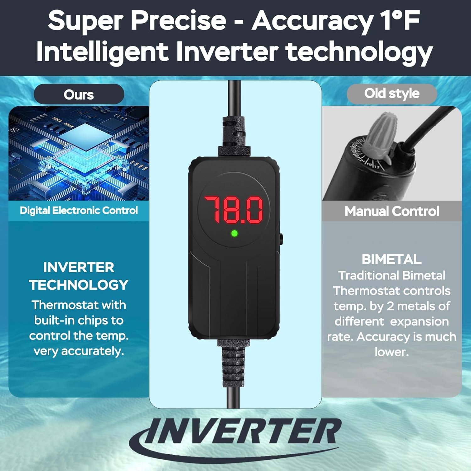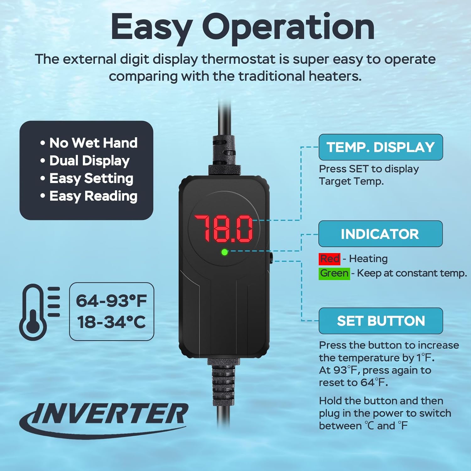 ADVANCED TEMPERATURE MANAGEMENT – Featuring advanced inverter technology and integrated chips, this aquarium heater maintains stable temperatures with an accuracy of ±1℉. Its user-friendly thermostat displays both current and desired temperatures for effortless operation.
