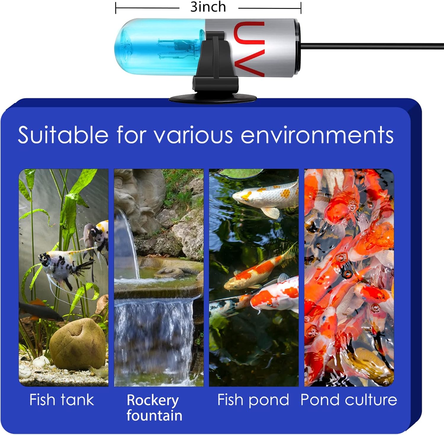 🐟Warm Notice – Please measure the size of your aquarium and compare with the dimension of our product before purchase. Instructions: Please do not watch the UV lamp for a long time, and avoid the UV lamp irradiating the skin. When using the aquarium disinfection lamp, please put it in the filter, or use an opaque plate to separate the lamp from the fish to avoid direct light shining on your fish and harm them, but please make sure that the water can pass through the plate.