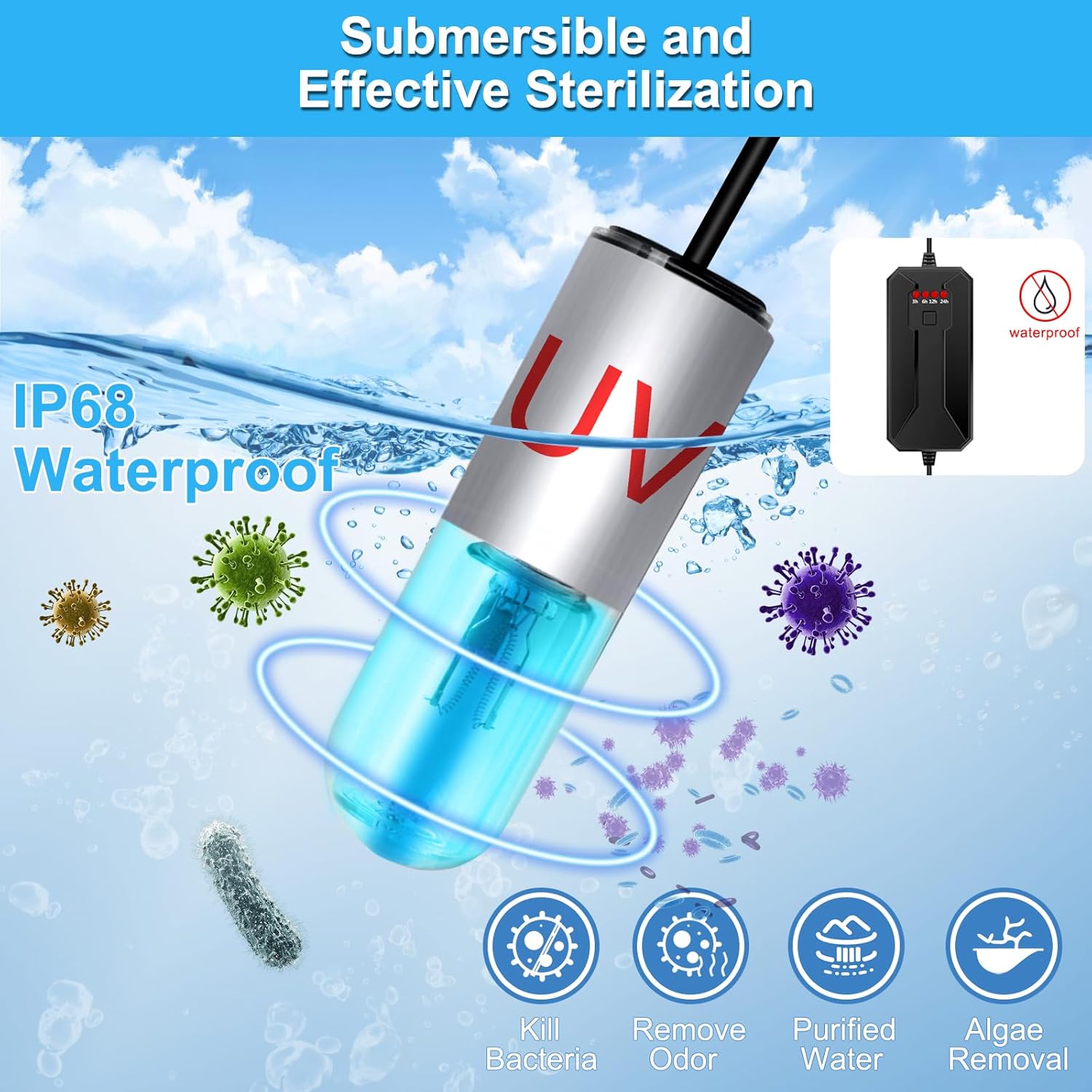 🐟Quick Disinfection – 254nm wavelength light help to remove the green in the fish tank, pond, make it clear.Extremely efficient and time-saving in use in in 30 minutes, which can provide a clean living environment for your fish. This would be the perfect choice for fish lovers.