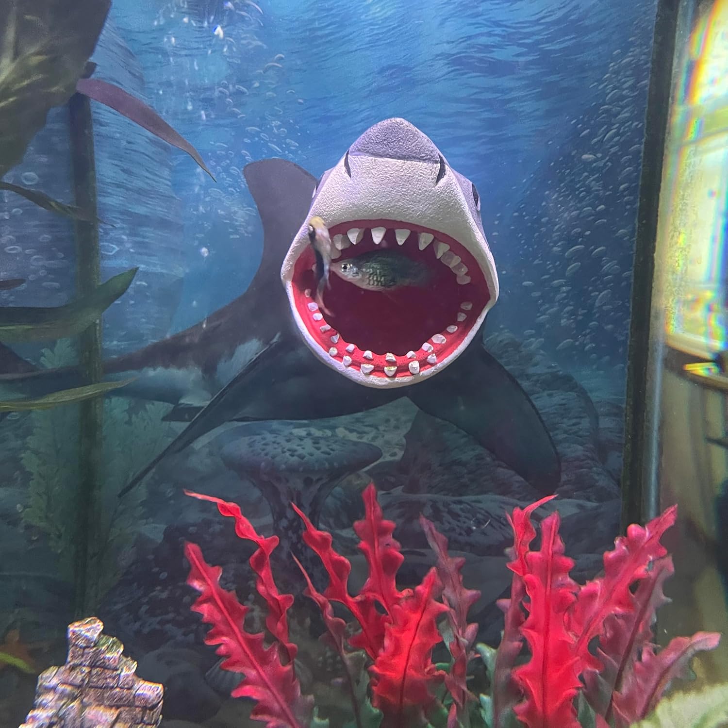 I am in love with this fish cave. It is so awesome. The size of the cave is perfect for smaller fish like bettas. It’s a great value for the money. It’s made very well durable but still light enough to stay wherever you place it. My Betta loves it, I left it just up out of the water so there is a air pocket inside of the cave. The function is perfect for Bettas or any fish for that matter. The color is perfect it looks extremely realistic like a great white is busting through the glass!! You definitely need this magnetic cave for your aquarium, no space isn’t a problem anymore cause this can be placed anywhere not just on the substrate.