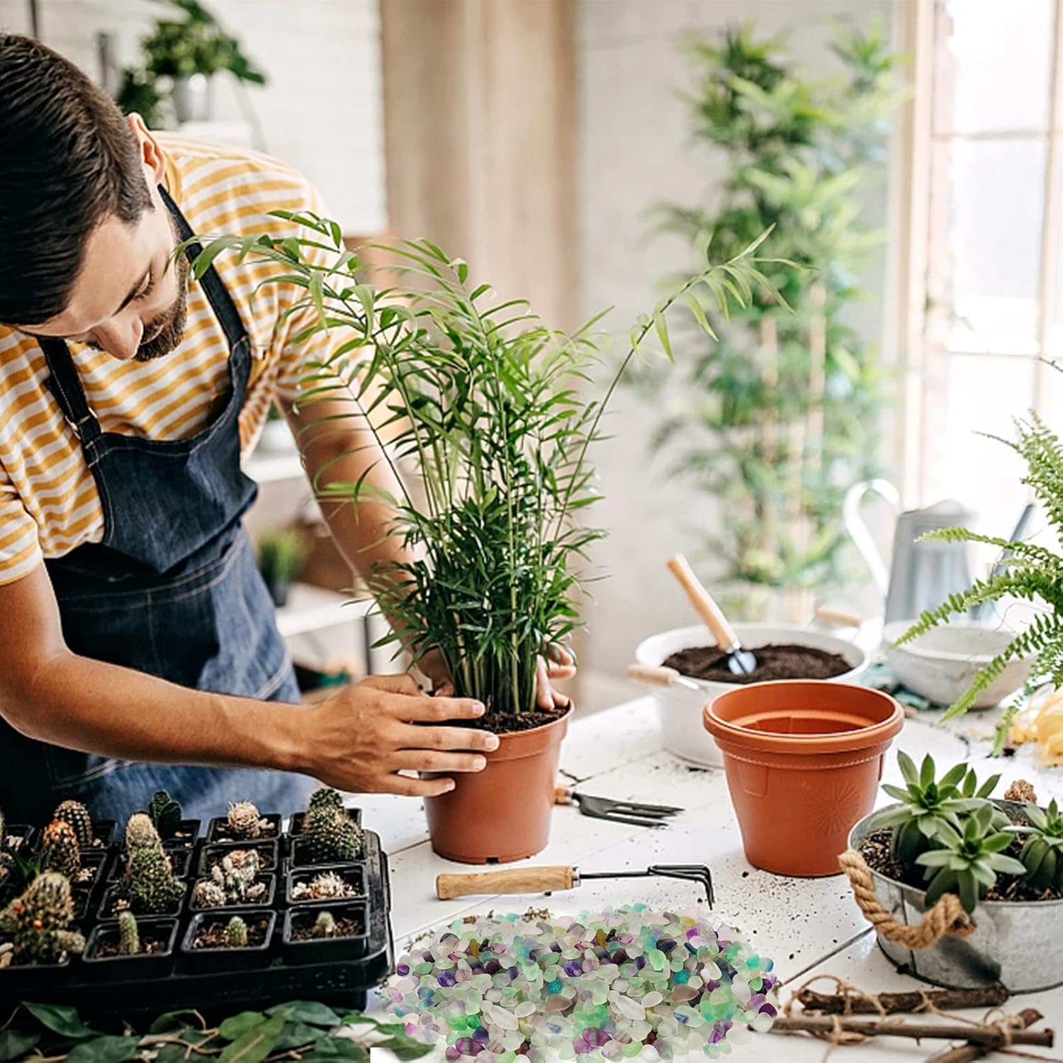 【Fluorite For Plants】:Mutilcolor Fluorite are wonderful when used as decorative accents on the top of the soil in garden pots,It is very convenient that using Fluorite on bare soil can create a clean and fresh finish to your container garden pots.