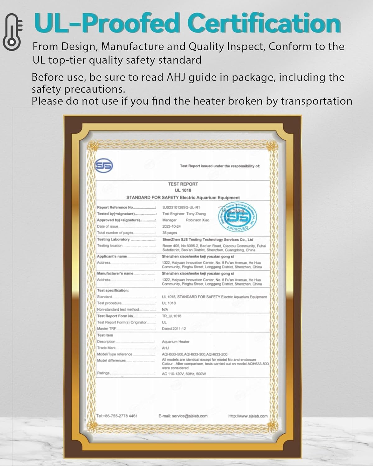 🐟🌡️[High Quality with Longer life span] 🐟Before the digital aquarium heater delivery, we have 100% conducted a 72-hour heating test in water to ensure the safety of the product. Using a thick quartz tube, 1.5m/4.75 ft cable(U.S. UL Certified), high temperature resistant protective case which Prevents water plants from adhering to the quartz glass wall and protects small fish not touching the quartz tube