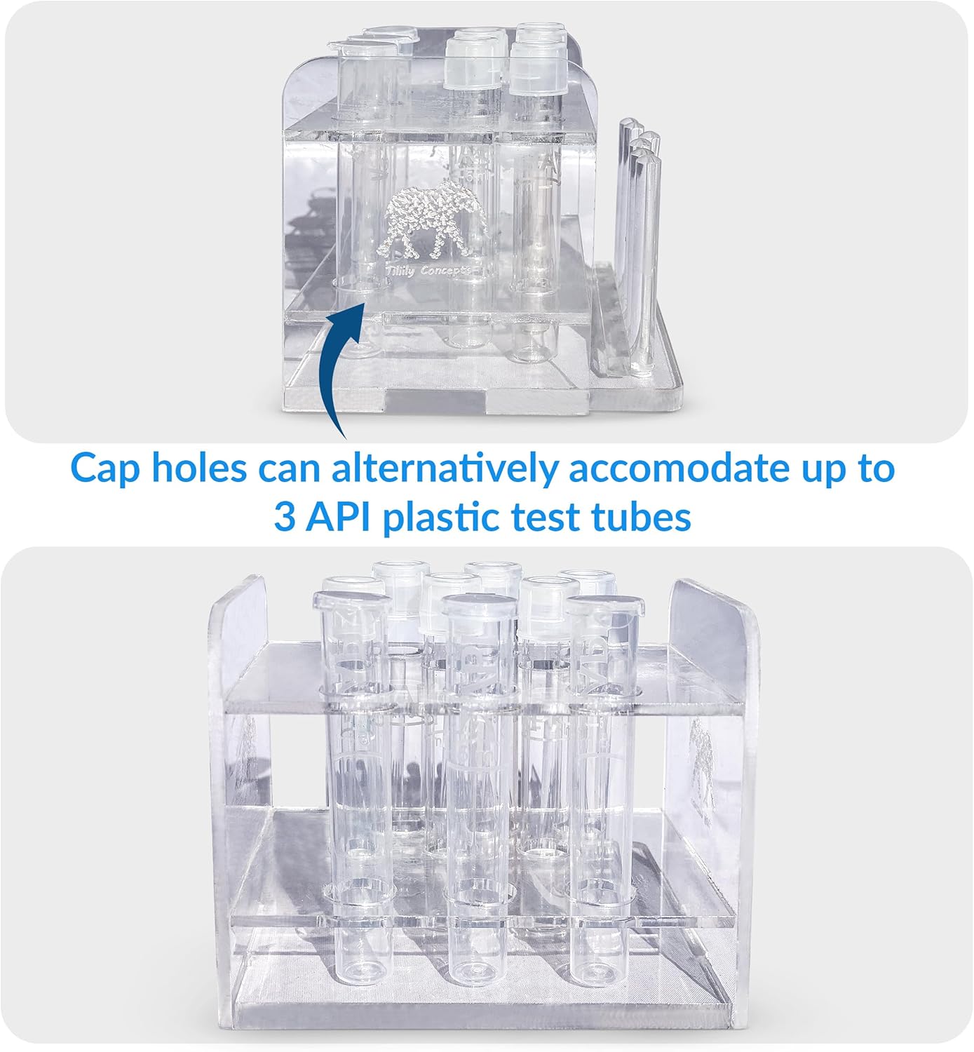 Designed for API and Tililly Concepts 5 ml glass test tubes (13mm diameter).