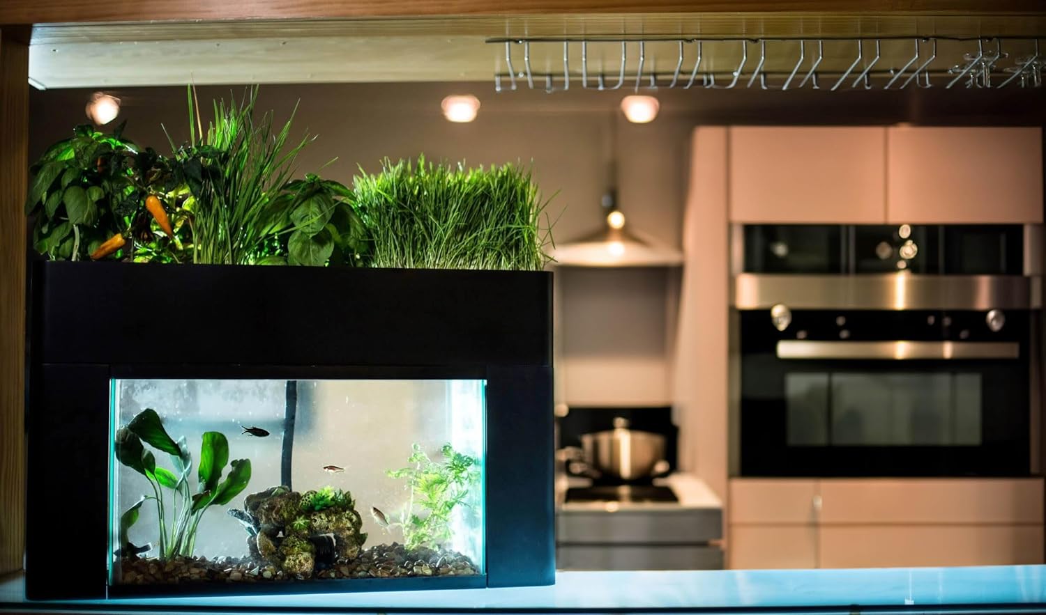 Fully functional indoor garden and aquarium system that allows you to grow plants and keep fish in an integrated ecosystem