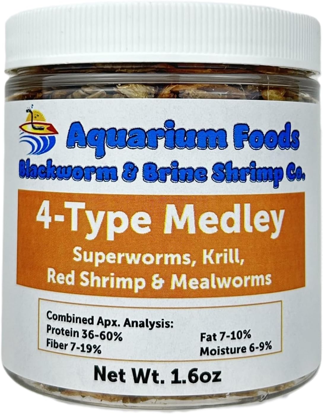 Aquatic Foods Inc. 4-Type Medley Mix of Freeze Dried Superworms, Arctic Krill, Red River Shrimp & Mealworms for Monster Fish, Aquatic Turtles, Reptiles, Rodents…1.6oz Sm Round Jar