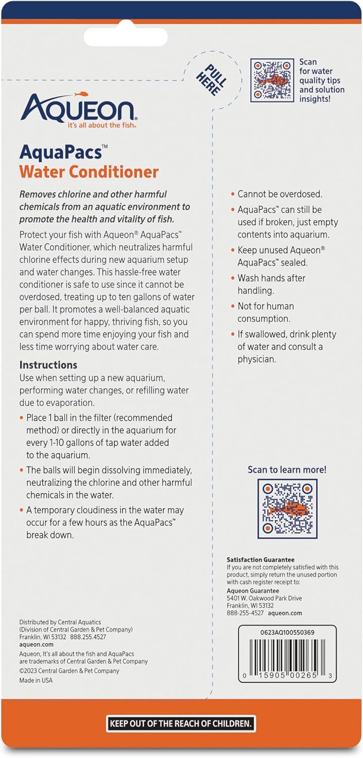 The Aqueon AquaPacs Water Conditioner 4 Pack is a convenient choice for keeping our aquarium water safe. Each pack treats up to 10 gallons, so itâs perfect for regular water changes. Itâs easy to use, and weâve noticed our fish seem healthier since we started using it. A must-have for any aquarium owner looking for simple and effective water conditioning!