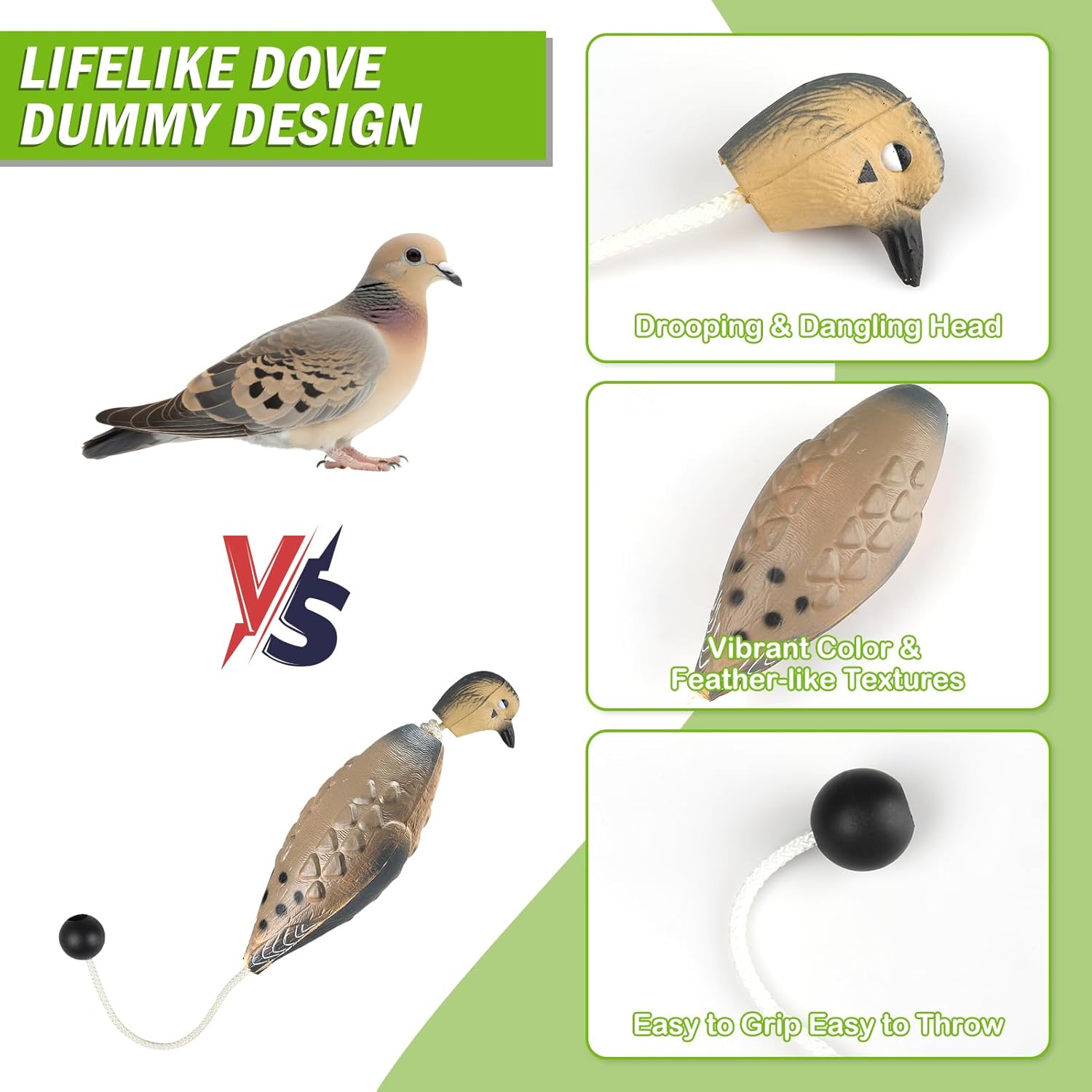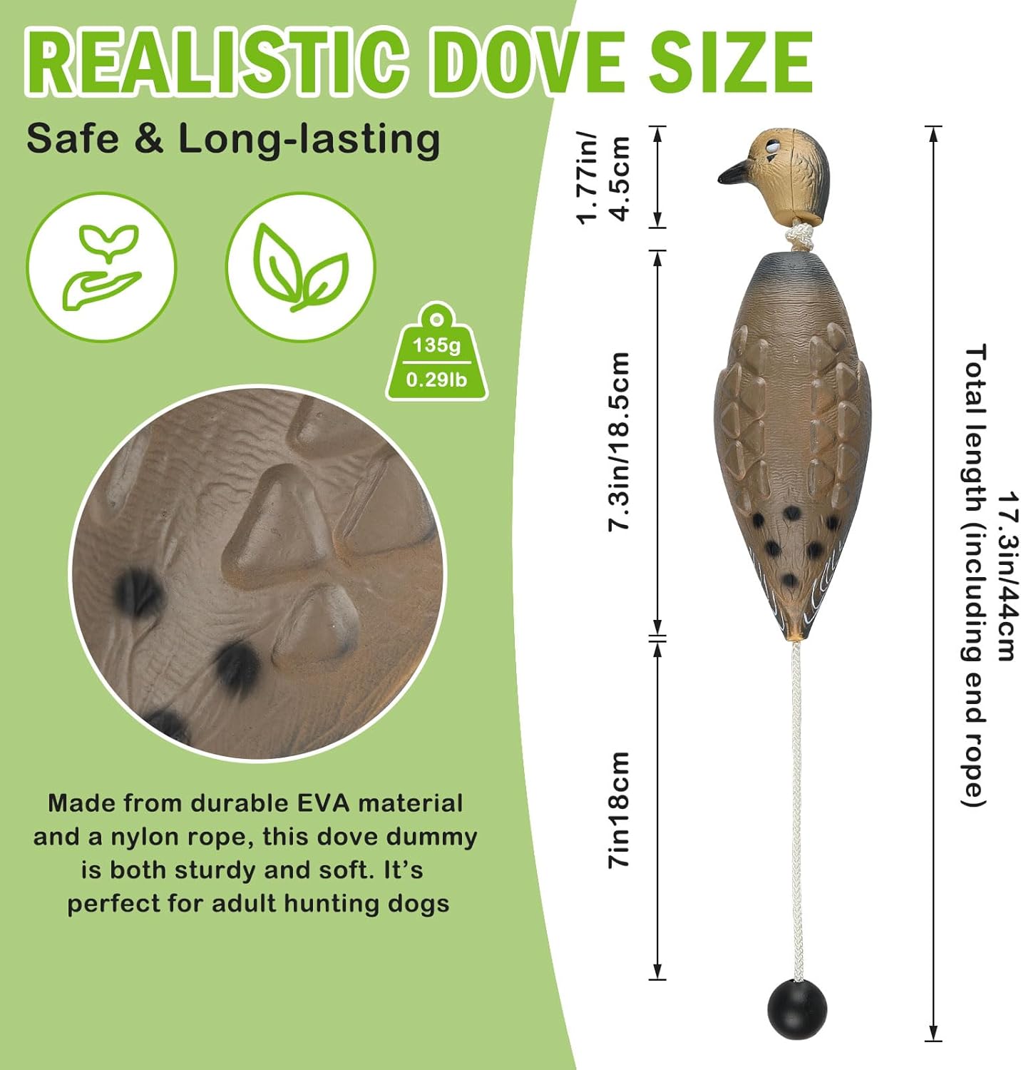 REALISTIC DOVE DUMMY: Featuring a vivid design with a drooping head, it perfectly replicates a dead dove falling from the sky. This realistic dove dummy bumper toy helps your hunting dog adapt to handling game in its mouth. Sized similarly to a smaller dove, it has a textured body and vibrant colors, further enhancing its lifelike appeal. Let your dog experience the thrill of real hunting and enjoy enhanced interactive fun