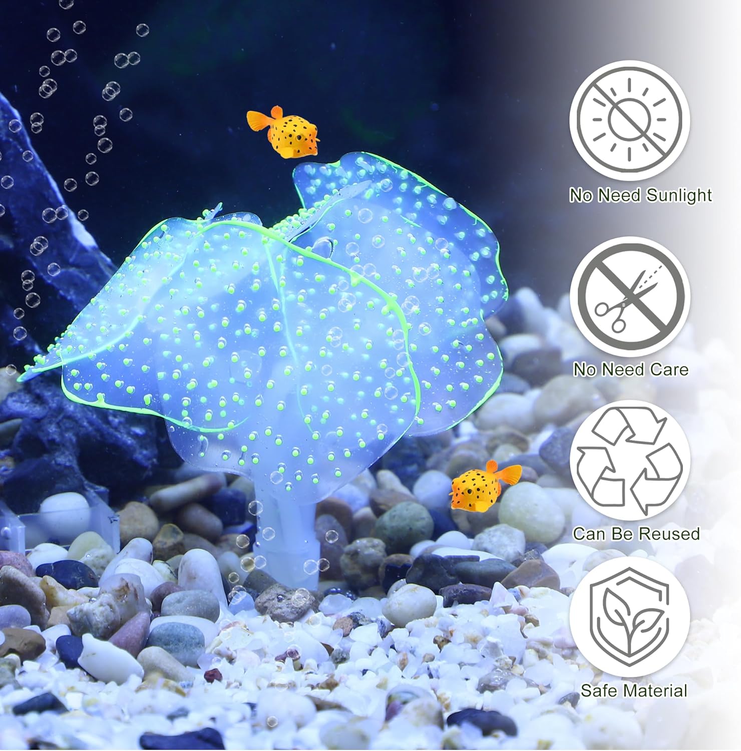 Feature – Glowing silicone coral plants can add color to your fish tank. Its brilliant colors sway gently with the water flow. Make your fish tank full of life, decorate different ocean worlds. Fish can shuttle and hide in the water, increasing the fun of fish playing.