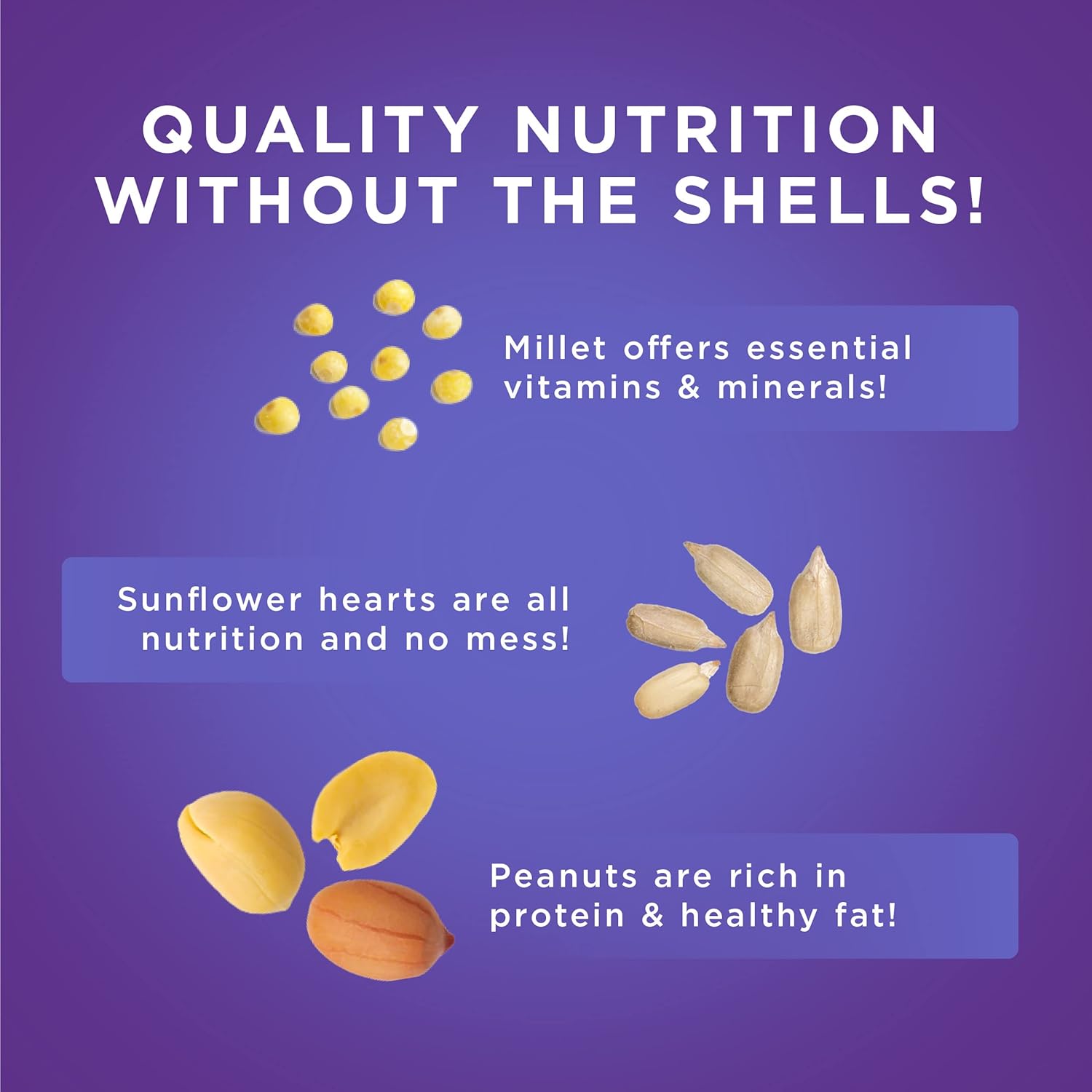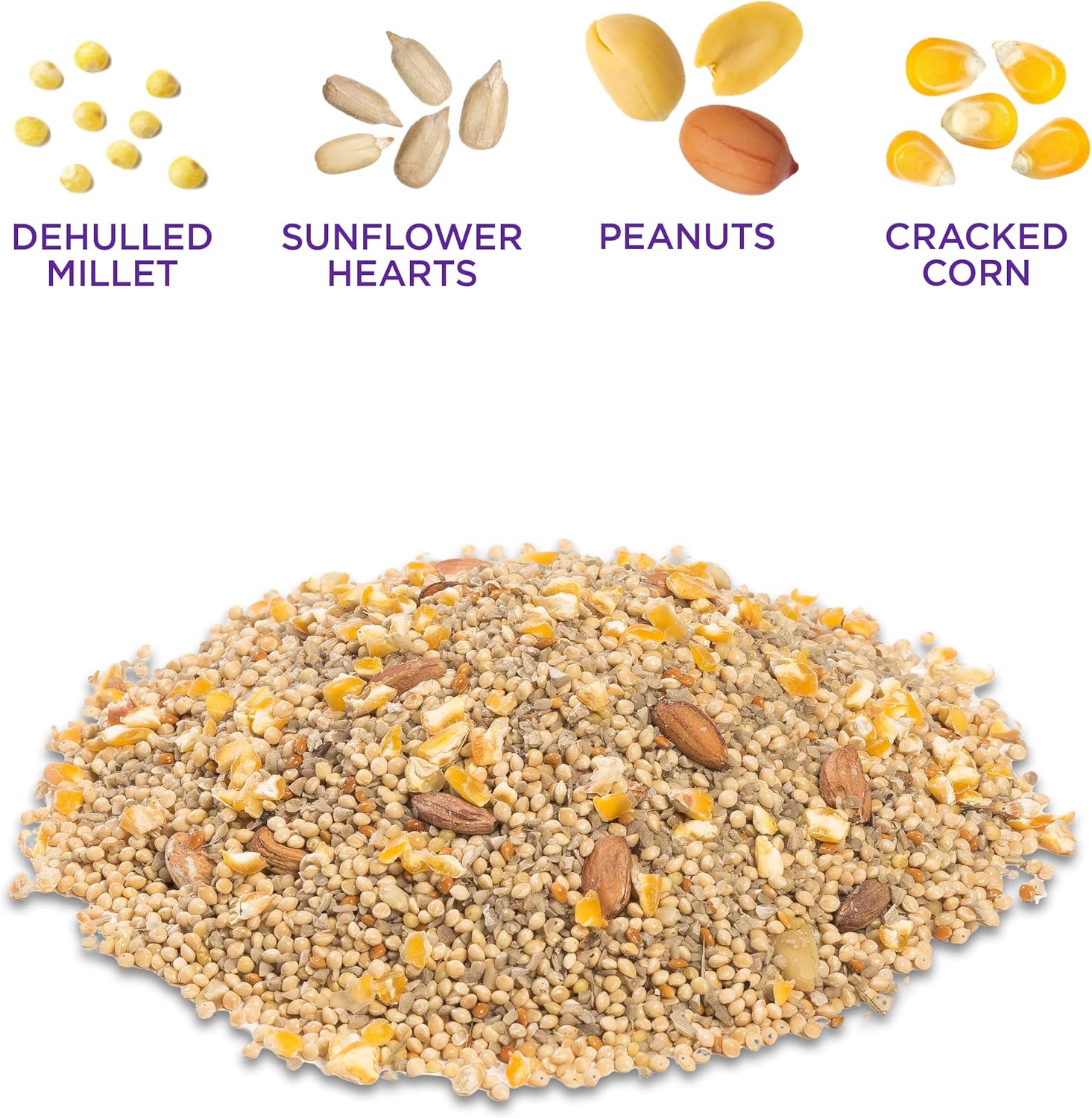 A gourmet blend of premium seeds and nuts with hulls removed especially designed to attract a wide variety of birds. Keeps the feeding area clean. Comes in a resealable space saving stand-up pouch for easy storage. FreshLock technology retains the flavor and freshness of the premium natural ingredients. Contains white proso millet, sunflower chips, red millet and peanut pickouts.