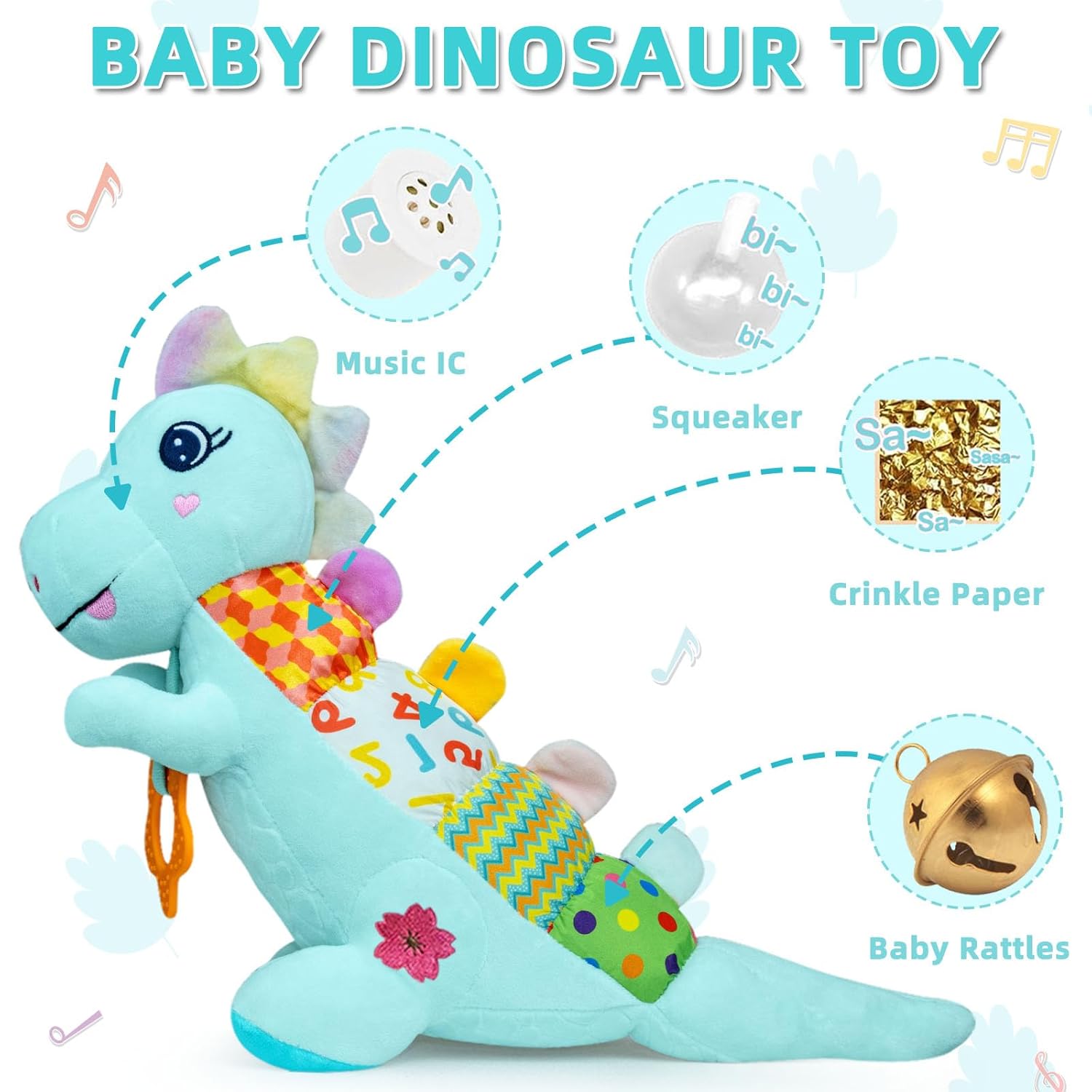 5 IN 1 BABY DINOSAUR TOY: Multi-Functional baby dinosaur plush toys combine the fun of crinkle sound paper,rattle, musical ic head, teether into this toy. Encourage tactile exploration for babies aged 0-6-12 months, let your baby experience different fun through cute dino toys.