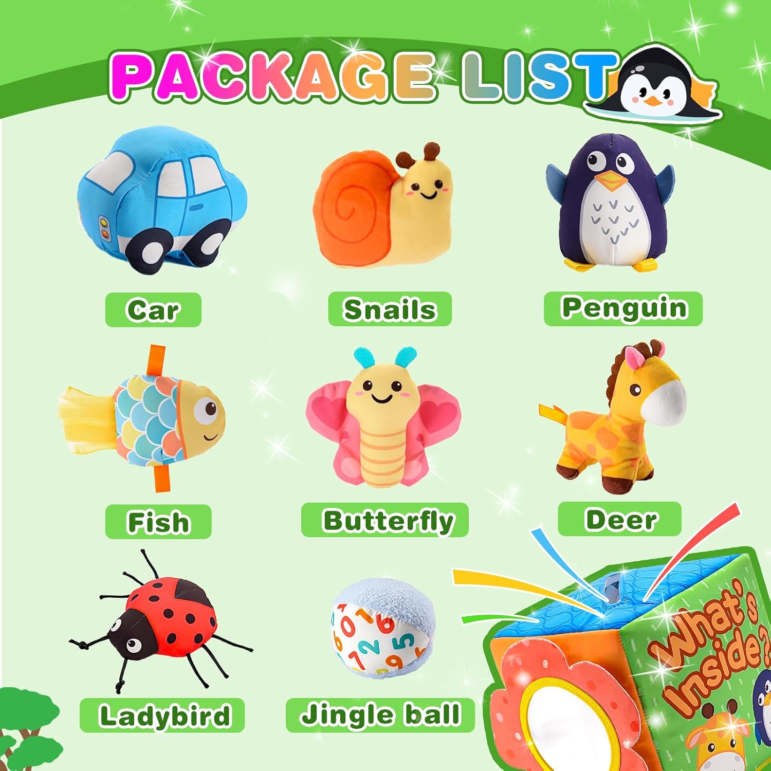 Multi-Sensory Busy Box: Engage baby’s senses with sounds & textures! our baby toys Includes 8 soft plush toys with crinkly, beeping and bell sounds to boost auditory development. Different textures (smooth, fluffy, ribbed) will enhance touch exploration for tiny fingers, a must-have for babies over 6 months old.