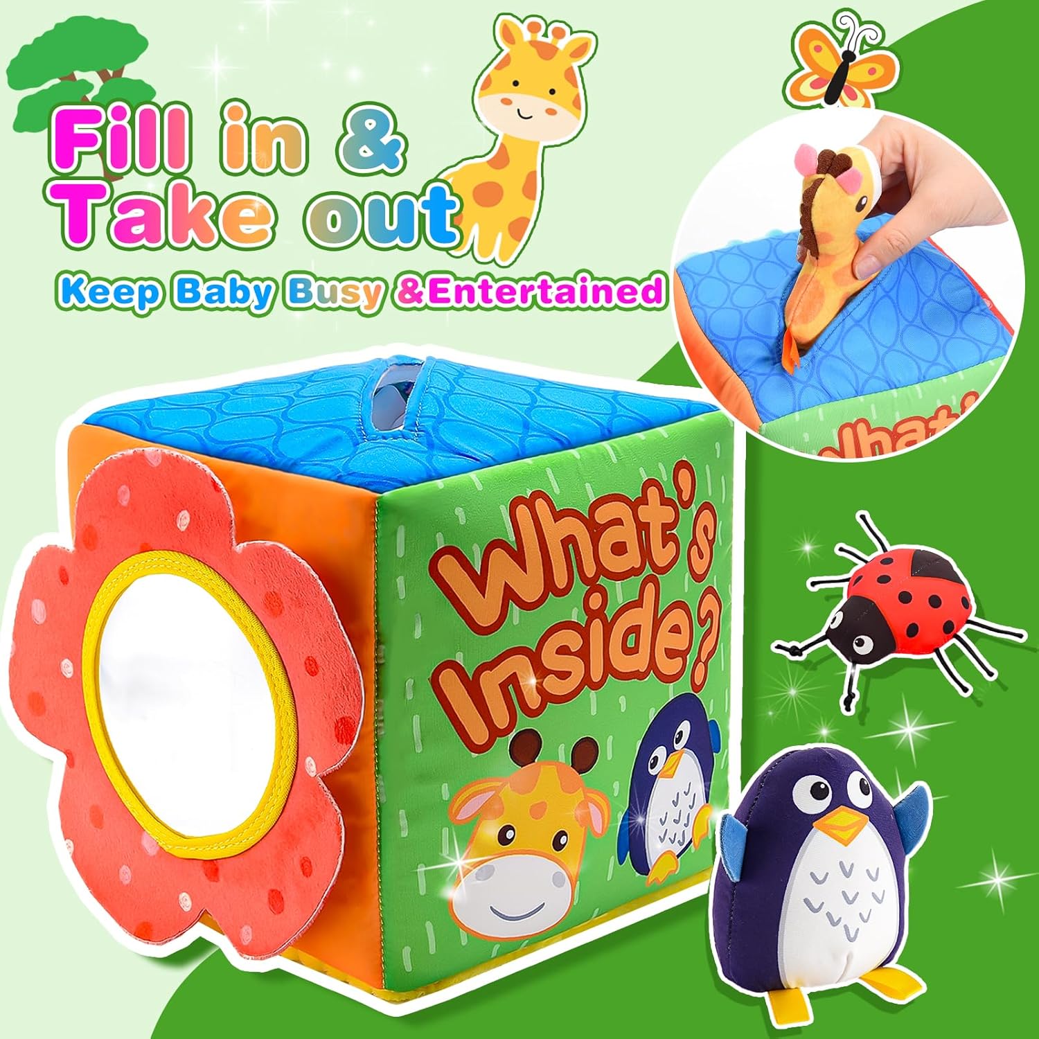 I love the bright colors and soft textures of this âWhatâs in the Box?â toy. Itâs made very well. The 8 includes animals, car, butterfly & ball are a good size for baby to grab. I love the this toyâs âhide it in the boxâaspect to teach babies when something disappears that itâs not really gone. And, having them learn to dig in the box to pull out the toys is engaging and will create giggles and fun times!I love toys that are built to store all the pieces and what better place to store all the 8 objects, but in this box! This toy definitely will help babies to focus and interact in new ways that will aid in their brain, sensory and fine motor skills development.When I first opened the fox, the cube was quite compacted, but I stuffed all the toys into it and added some socks toit until it was puffed out a bit and let it set for a while to help it reshape into the box form. When I took the items out, the box form maintained itâs shape well. The cute mirror is a nice touch too. And, it comes in a nice box that will make gift giving easy.The box and the toys appear to be of good quality and stitching. And, toys are fluffy and well stuffed. There is nothing lose on this toy set that would cause a choking hazard or be unsafe for baby. I especially love the little lady bugâs legs. So cute! This toy will be great for tummy time.I would recommend this product for itâs overall cuteness, quality and value!