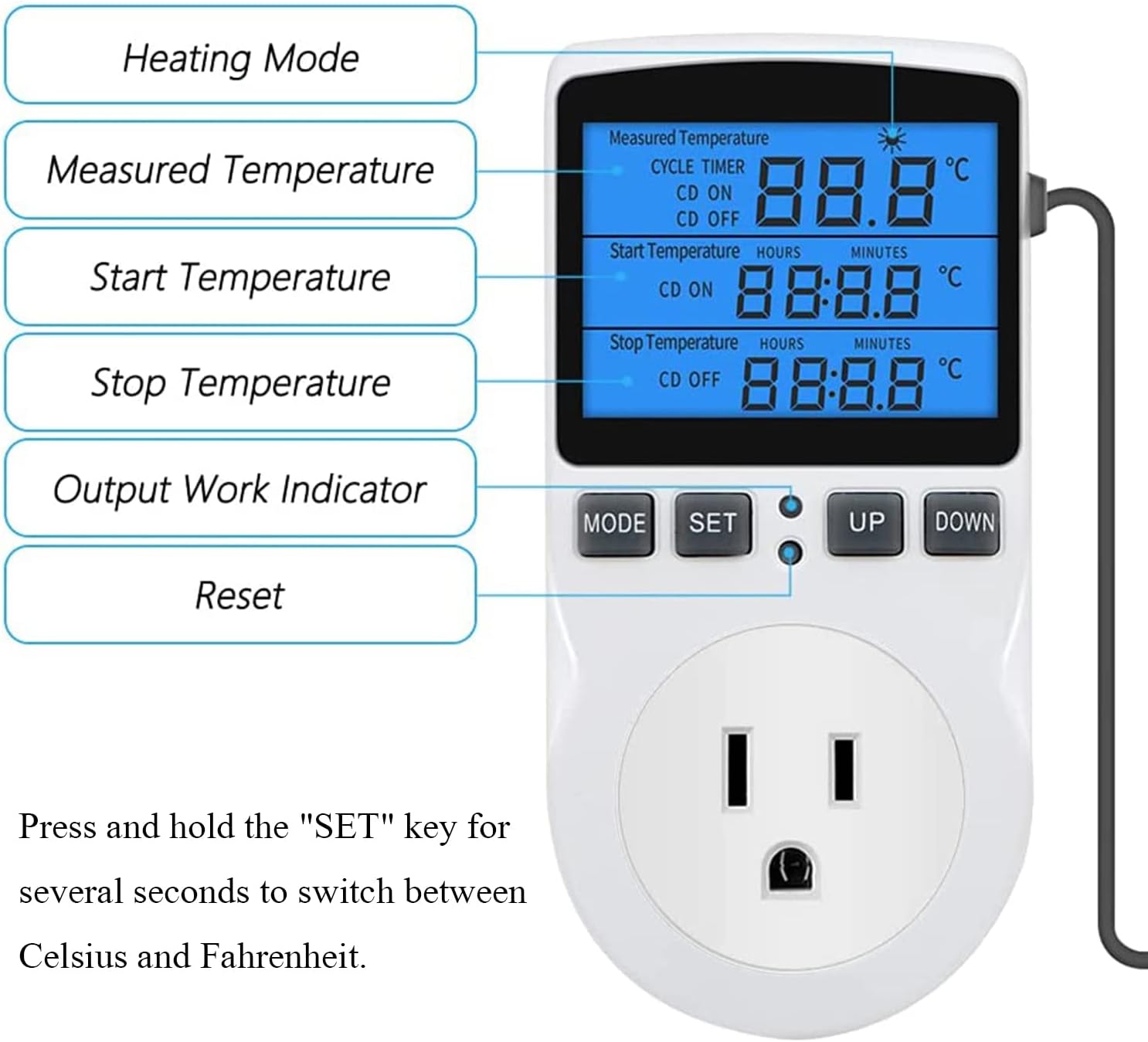 WIDE RANGE OF APPLICATION : This thermostat plug socket is widely used for greenhouse, reptile, incubator, terrarium, freezer, refrigerator, heater, fridge, homebrew, vivarium, fermentation, heat mat, and other temperature-controlled system. It can also be used as a timer for cycle timing and countdown.