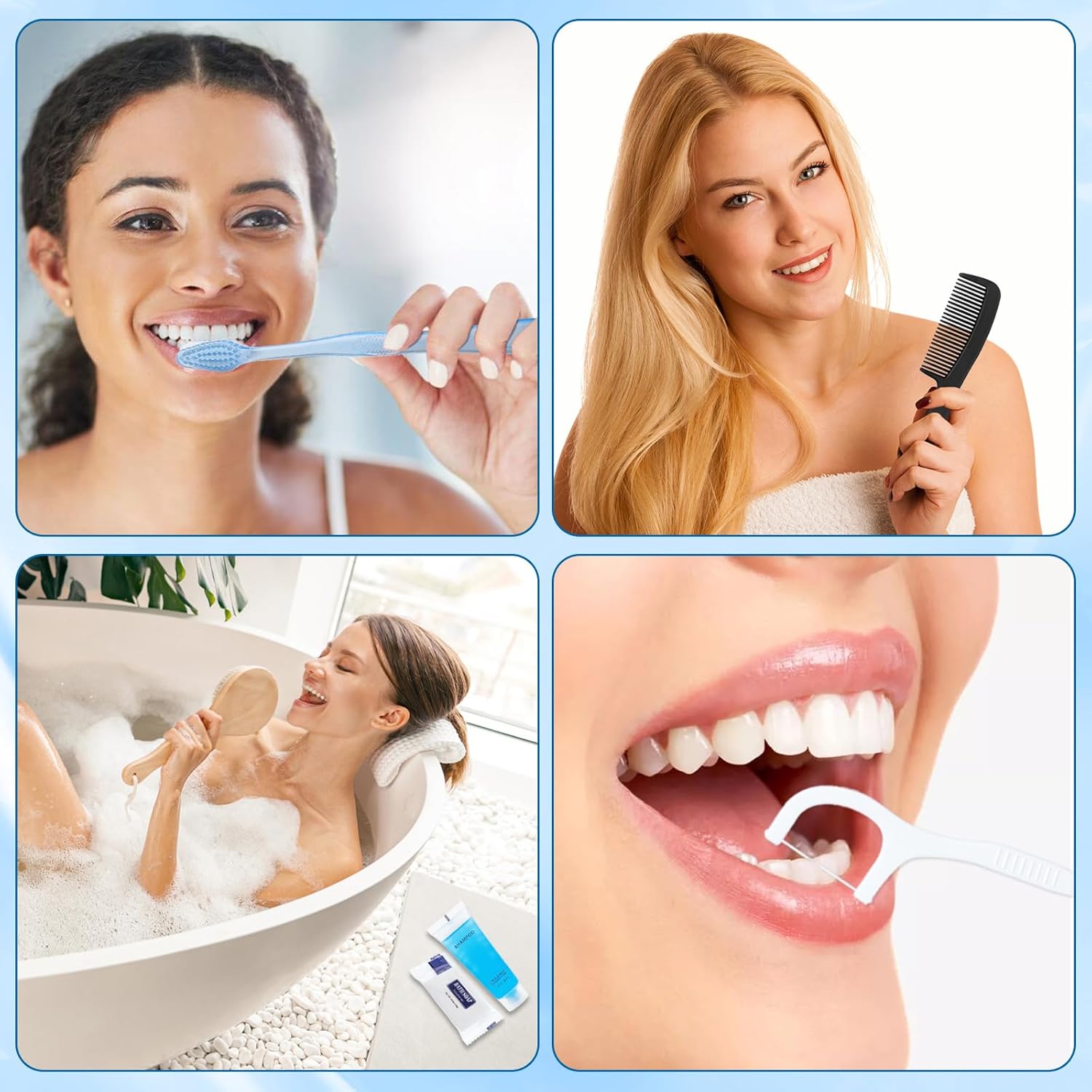 What you get: Pack of 5 Basic Toiletry Kits. Each package includes 1*Soap(14g/0.5oz),1*Toothbrushes, 1*Toothpastes(14g/0.5oz) ,1*Shampoo(1 floz/30ml), 1*Combs, 1*Toothbrush head cover, 5*Floss picks,1*vantity kit,1*Reusable zipper bag. Each set packed in a sealable bag for hygiene.