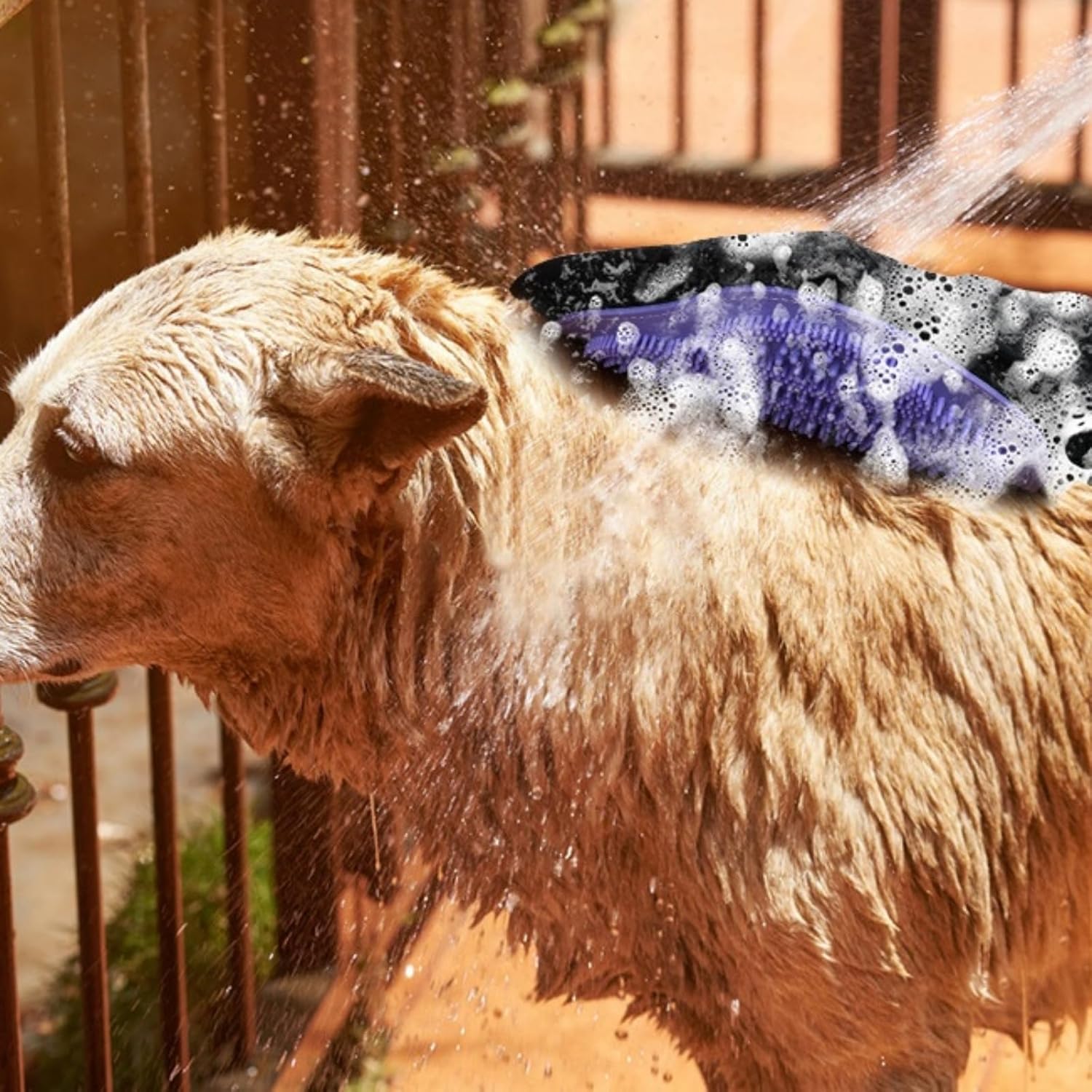 Massage & Rinse: You can flip to the massage side to help distribute the shampoo and soothe your pet. Rinse thoroughly while wearing the gloves to help wash away all soap and loosened hair.