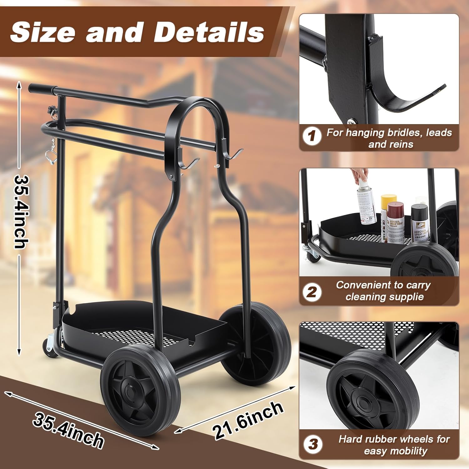 Unmatched Durability and Stability: Crafted from quality heavy metal, the foldable horse tack cart boasts a robust structure and impressive load-bearing capacity. Its anti-rust surface ensures longevity, while smooth-rolling wheels provide stability without shaking during transport, ensuring reliability in various settings; There are two metal hooks at the rear of the car for hanging bridles, traction ropes and reins