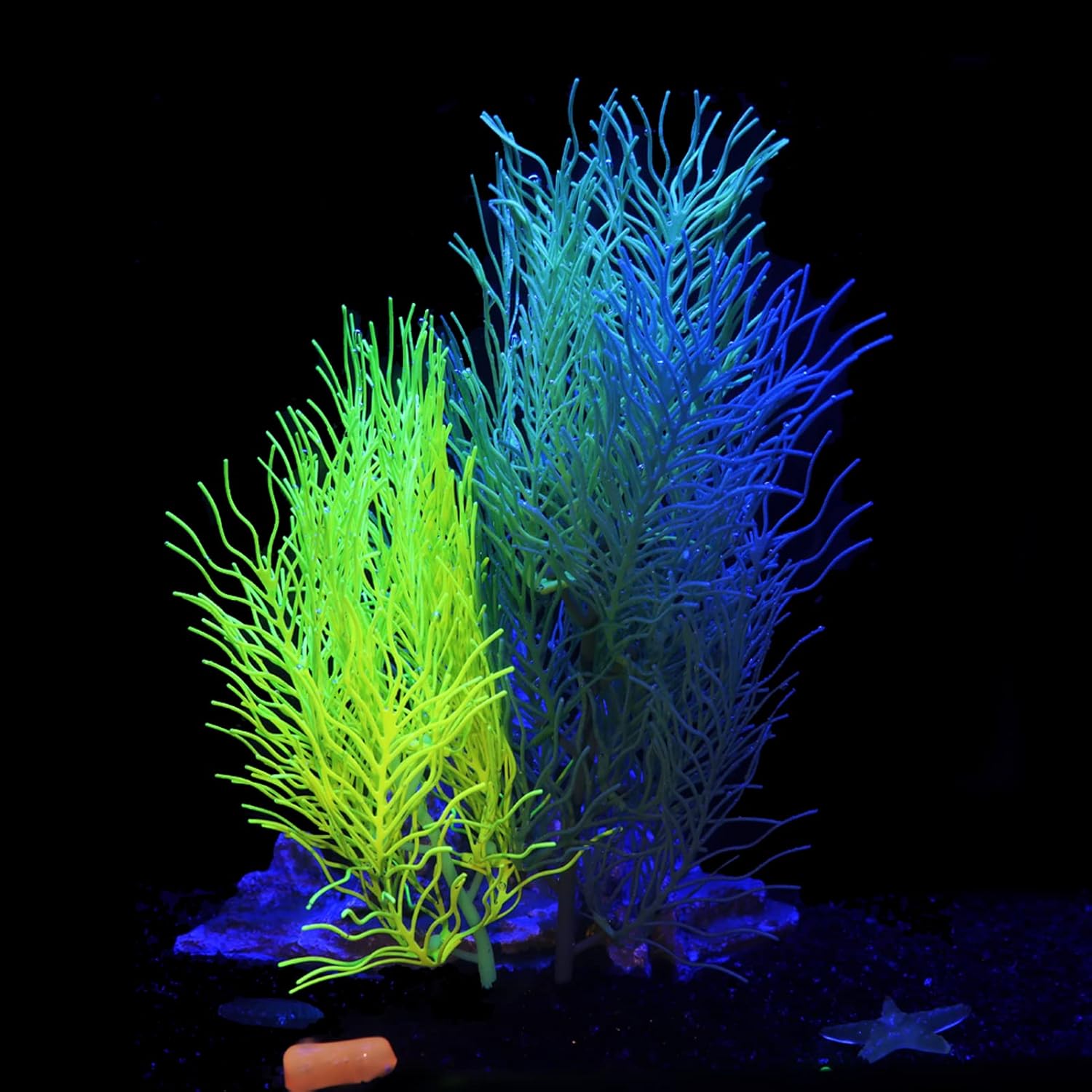 UNIQUE GLOWING DESIGN: LPFLASAT plant fish tank decoration has a glowing effect and the glowing effect will only happen under the blue lighting. Fish tank decor will be more dreamy than under the natural light, so we highly recommend using this product with blue light