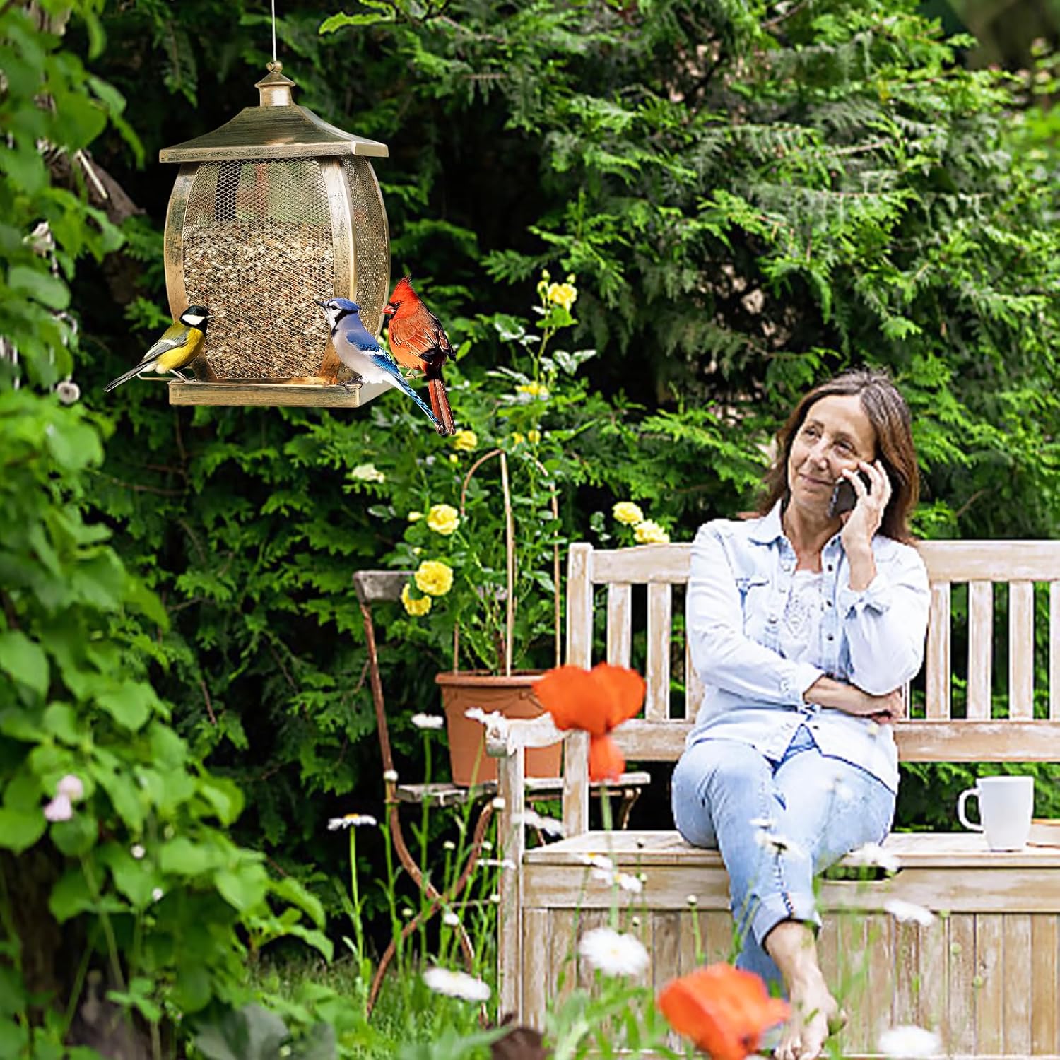 𝐃𝐮𝐫𝐚𝐛𝐥𝐞 𝐁𝐢𝐫𝐝 𝐅𝐞𝐞𝐝𝐞𝐫: Bird feeder made of premium iron with a copper-plated finish and rust-proof coating, ensuring long-lasting performance in all seasons.The large bird feeder can withstand harsh weather conditions such as snowy days and rainy days.