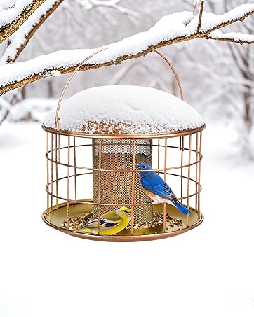 I love this bird feeder as it is pretty and it has a large capacity to hold seeds, up to 5 pounds. It feels well made and heavy duty, made of iron and I love the copper washed color which the seller states is a rust proof coating. To fill, you just lift up the top of the feeder and pour. Easy peasy!There are perches for the birds to rest on around the entire perimeter of the feeder and 8 drainage holes to prevent water from building up which helps keep the seeds somewhat fresh. The sides are a mesh design which allows some air flow which will also help keep the seeds dry and fresh. There is a metal hanging hook which seems fairly strong. The seller info states there is a squirrel proof buckle on the top which is a secure locking mechanism that prevents squirrels from opening the feeder and having a feast. I haven’t seen any snacking squirrels yet!This feeder is a great value and it is pretty. The only downside is that when it is full, it is fairly heavy so you need to have a secure pole in the ground to hang it on or it could tip over. I have only been filling it half way to make it easier for myself. The birds are pretty happy and stop by to snack all day.
