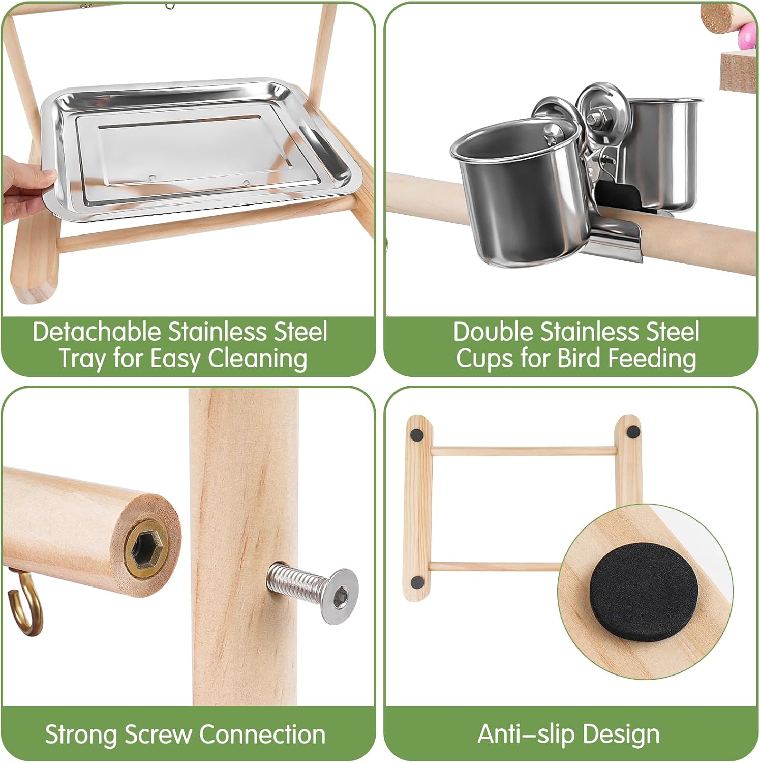 Easy to assemble: Our bird play stand is completely handmade, all parts are screwed without glue. Easy to assemble by following the instructions. All accessories can be easily removed and installed on your bird cage. Quality wooden rods, stainless steel and screw connections ensure that the bird is safe and secure while playing.