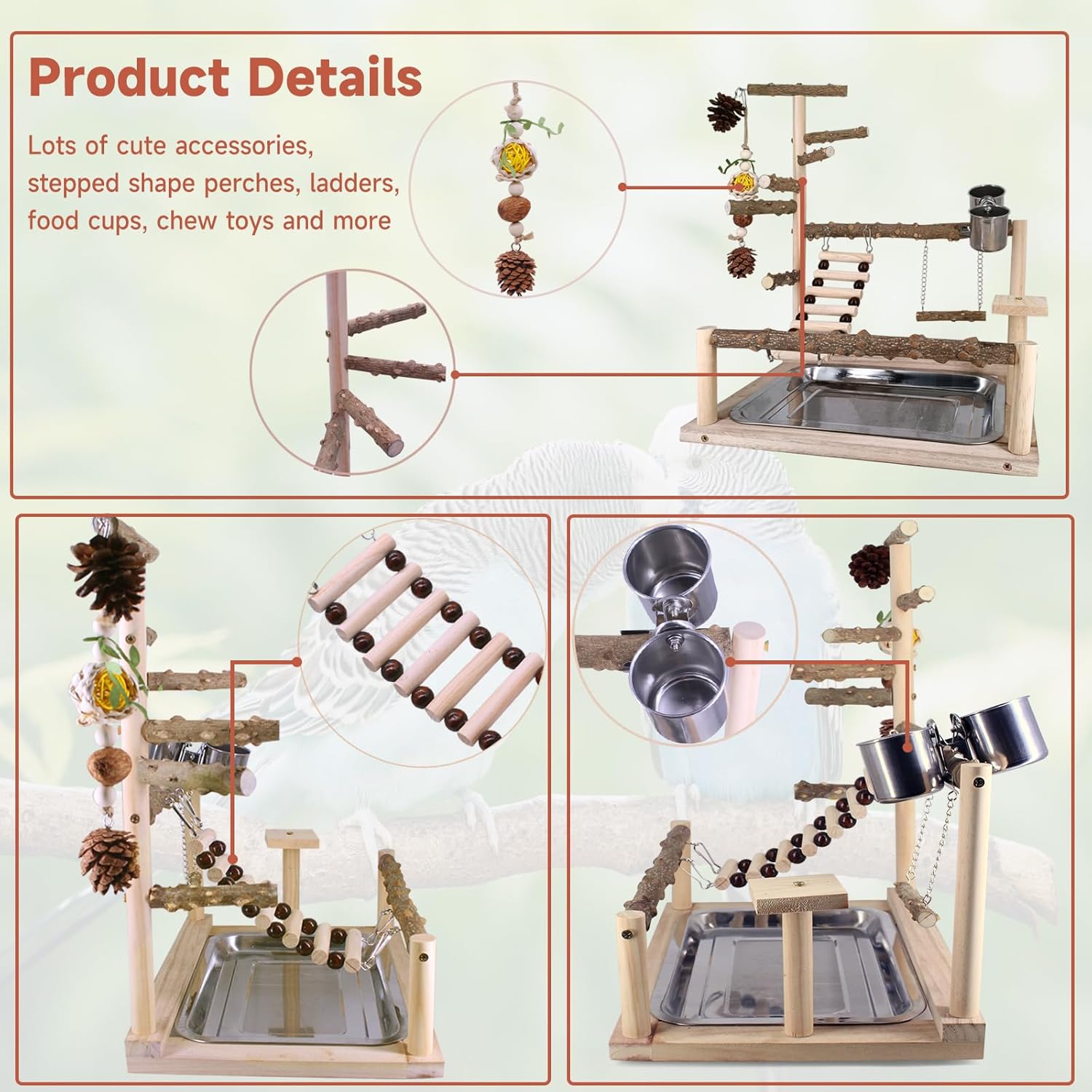 Exercise, Play, and Feeding: In order for birds to get more exercise, this bird playground is designed with different lengths of stands, where birds can exercise at any time. In addition, there are chewing toys and swing for birds to play. And a pair of food cups can hold birds’ food and water, as a bird feeder