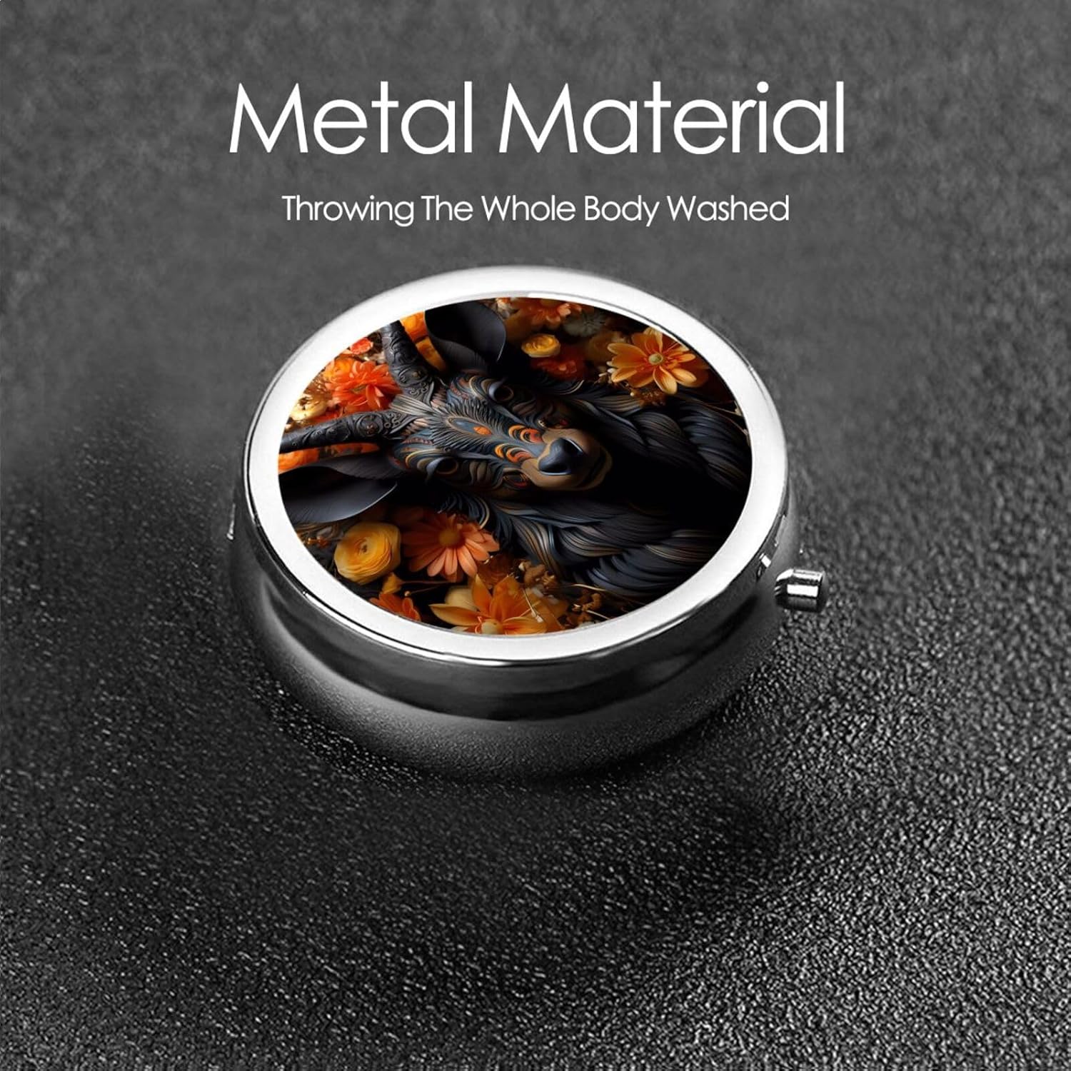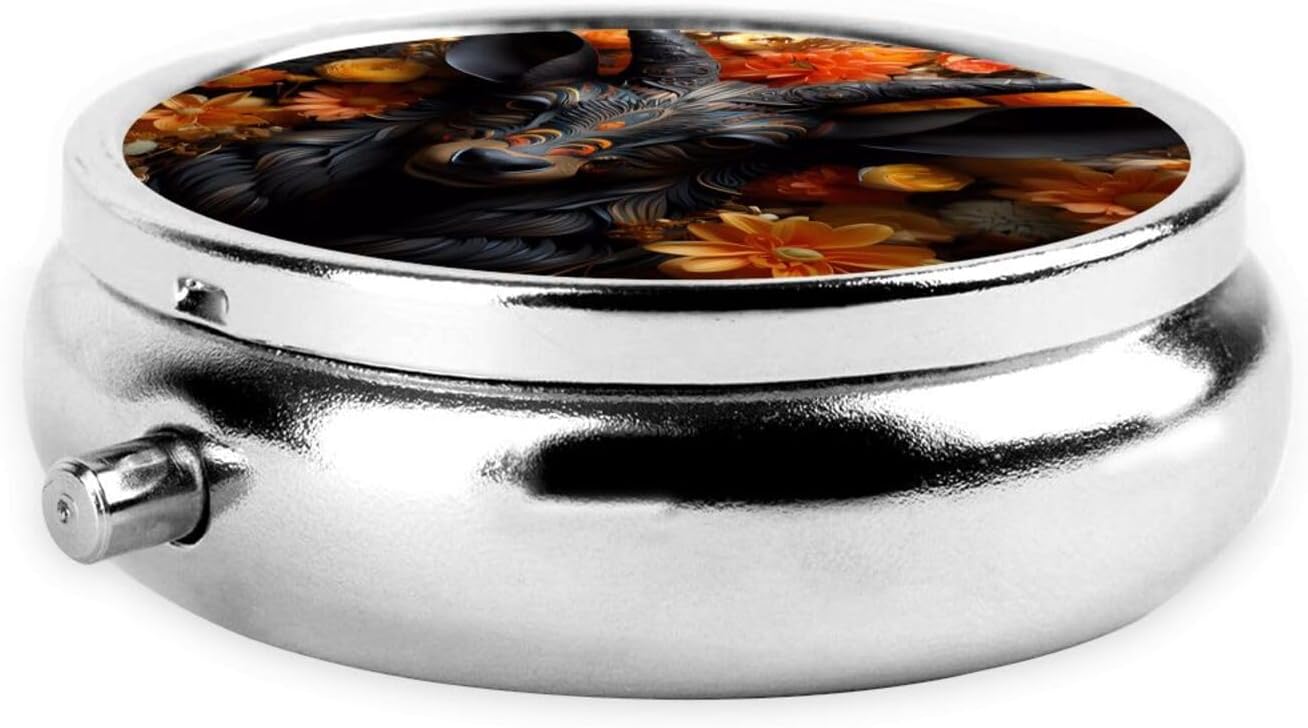 Black antelope with flowers Stay organized and stylish with this Round Pill Box – a portable medicine storage container perfect for vitamins, supplements, fish oil, and more. Designed with a full-print exterior, this pill box is not just functional but also a fashionable addition to your daily routine. Made from durable electroplated metal iron, it offers a premium feel and long-lasting performance.