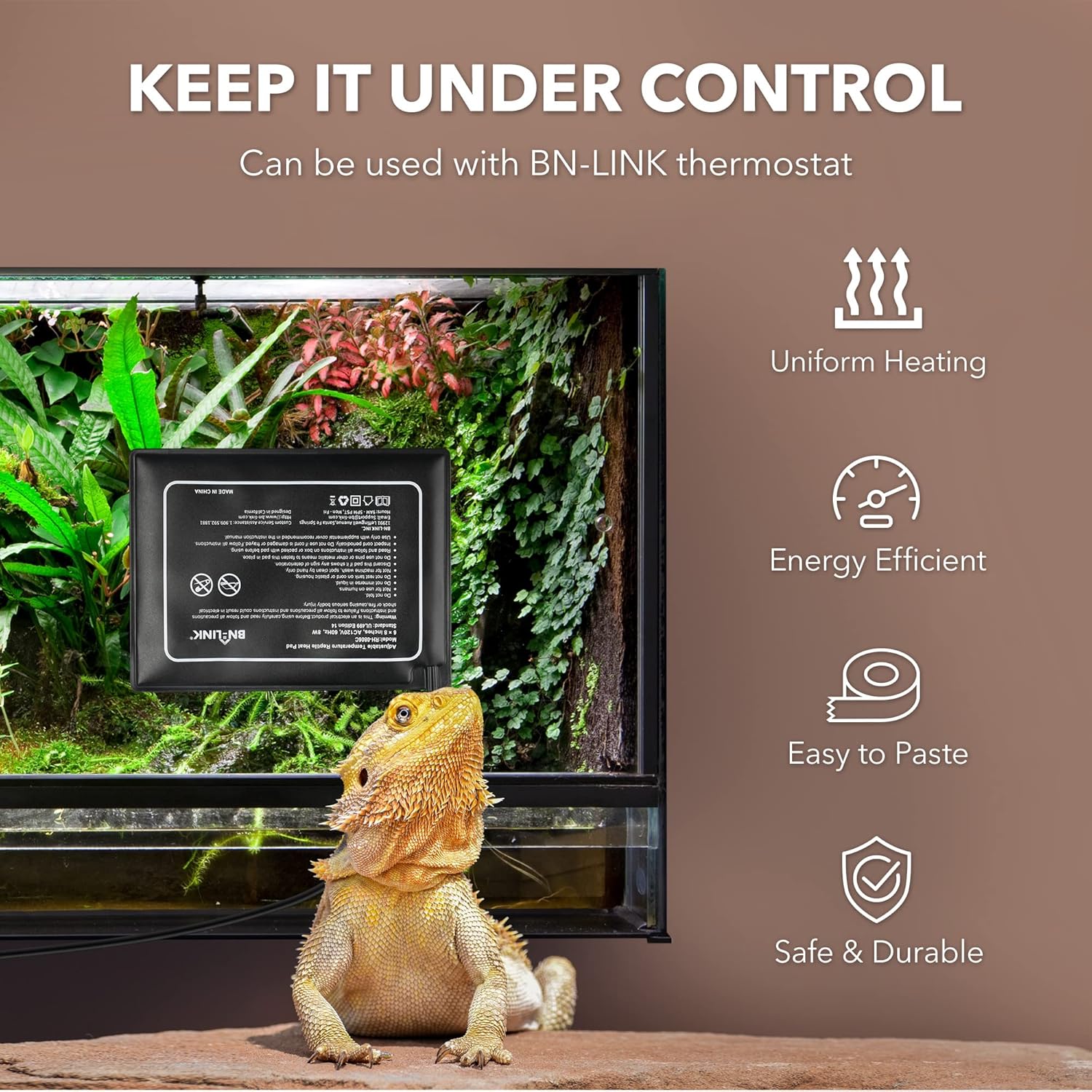 ENERGY EFFICIENT AND SPACE-SAVING: The BN-LINK reptile heat mat is both compact and packs a punch. The heating wire and insulation allows the mat to reach the desired temperatures within minutes yet only uses 8 Watts to help you save on electricity costs.