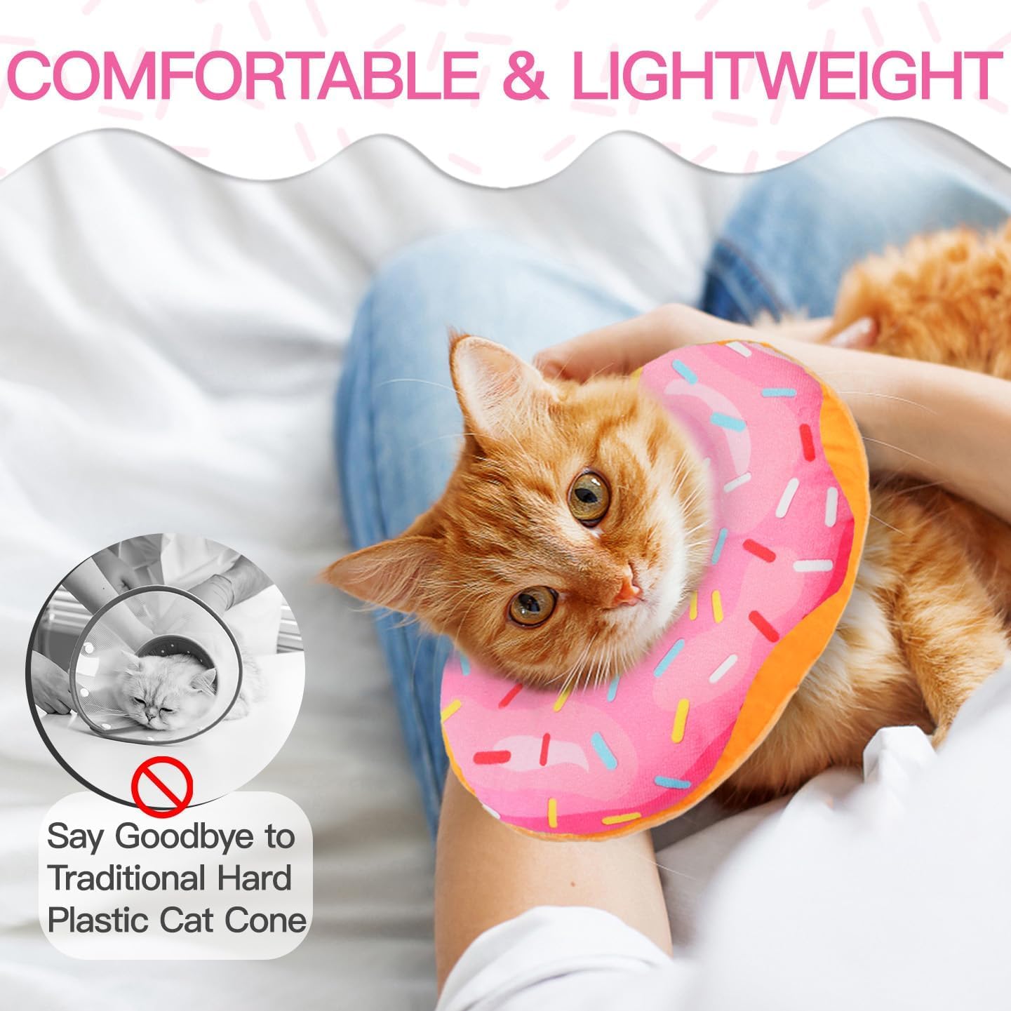 GREAT PROTECTION FOR YOUR PETS: Which is a perfect cat cone alternative after surgery. WONONE Cat donut collar works like a plump barrier around your cat’s neck, can effectively prevent your pets from biting and licking injured area or surgical site. Not just recovery after surgery, It is also suitable for in vitro deworming, nail trimming, and grooming. With this collar on, the playful and adorable donut shape makes it like a pet ornament instead of a cat surgery collar, your pet must be a million times happier with this