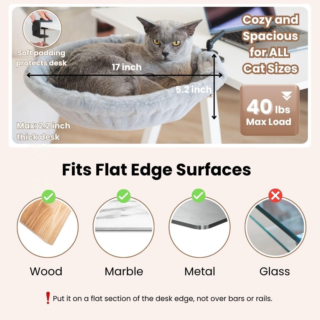 [Stable and Safe Cat Desk Bed]: Unlike other cat desk beds that wobble, our desk mounted cat bed is engineered with a reinforced clamp and non-slip foam pads for extra stability and safety. The pads protect your desktop from scratches while preventing movement, so your cat can jump in and out with confidence, while you enjoy peace of mind knowing your pet is safe. The perfect sturdy cat bed and ergonomic cat bed for large and small cats up to 40 lbs.