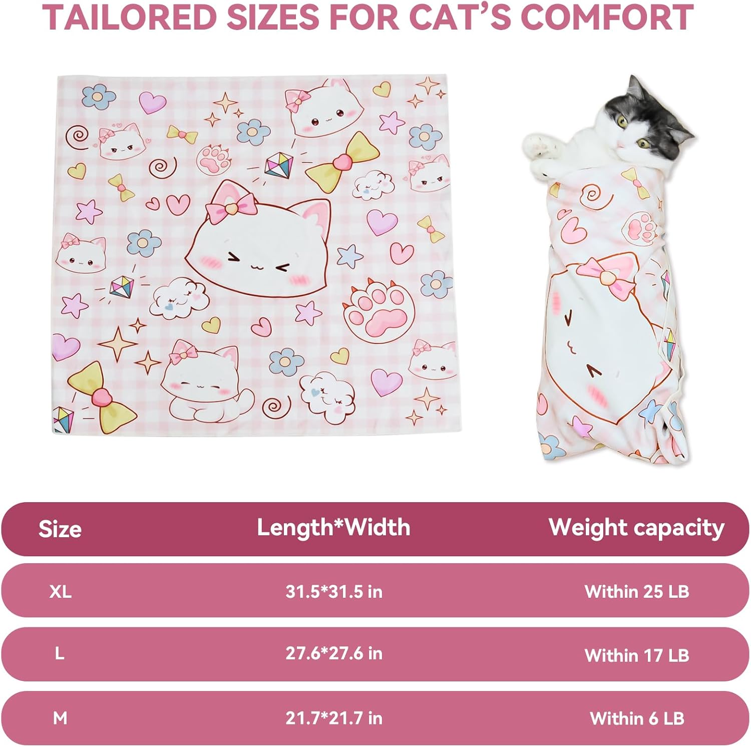 I received the Large size with the kitty pattern to try on my cats. The design is adorable, and the wrap is very soft â the inside has a microfiber-like feel that helps prevent slipping, which is great when dealing with squirmy cats.While the size fits three of my cats, my other cat is close to 20 lbs, and so the XL size would probably have worked better for him. If in doubt, size up.The biggest challenge, of course, is getting your cat to stay still long enough to wrap them! I havenât been successful yet, even with my smaller cat, but I plan to try again when theyâre more relaxed or sleepy.This wrap feels sturdy and well-made, and I really wish Iâd had it when I was giving meds to two of my cats in the past. Even if you canât do a perfect “burrito wrap,” this would still offer more control and protection than the towels I used before.Overall, it’s a useful item â especially for pet owners who need to administer medication or grooming â but be mindful of sizing and your cat’s cooperation level!