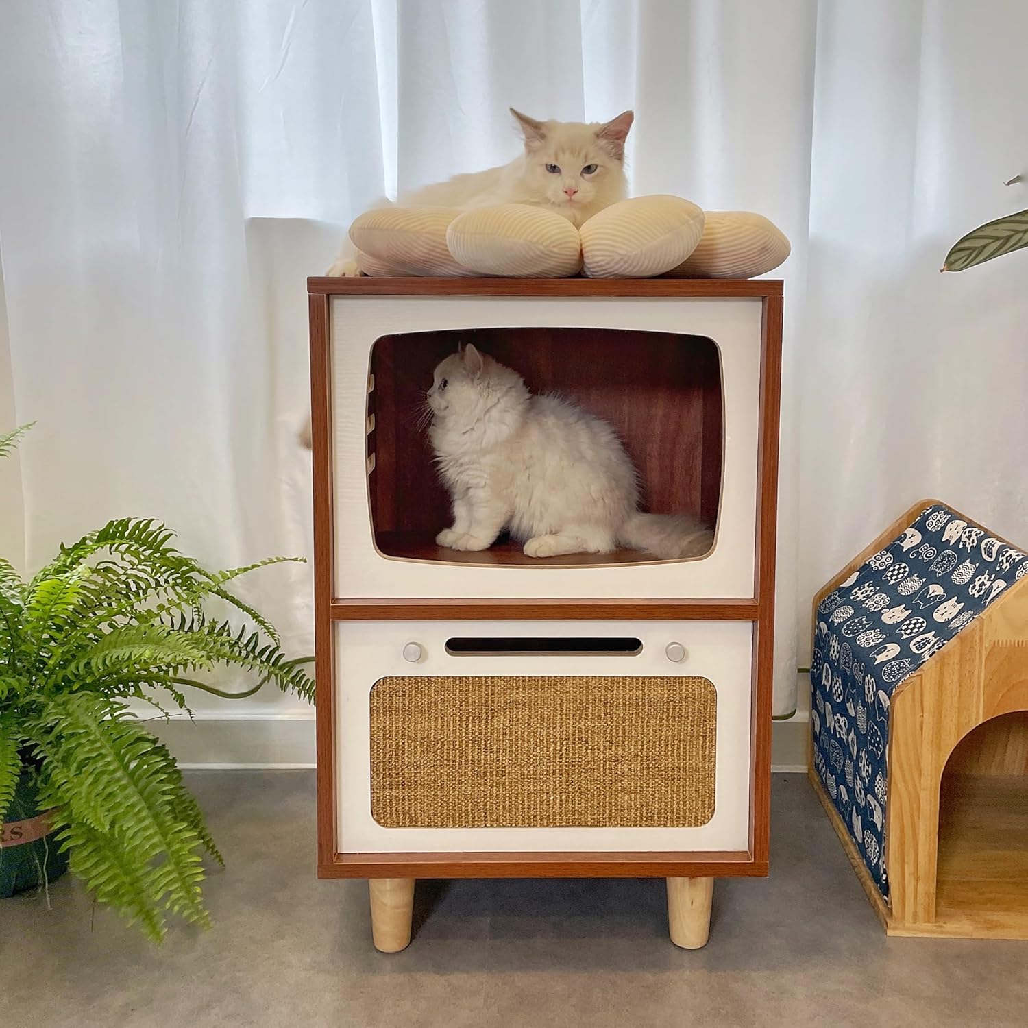 I absolutely love this cat house! The retro TV design is adorable and instantly became the highlight of my living room. The wood finish feels smooth and high-quality, and it blends perfectly with my furniture. My cat quickly accepted it as her favorite spotâshe enjoys curling up inside and peeking out like sheâs âon TV.â The ventilation holes keep the space airy, and the little storage cabinet below is a nice touch for toys and treats. Easy to assemble, very sturdy, and stylish. Highly recommend to any cat owner who wants something both practical and decorative!