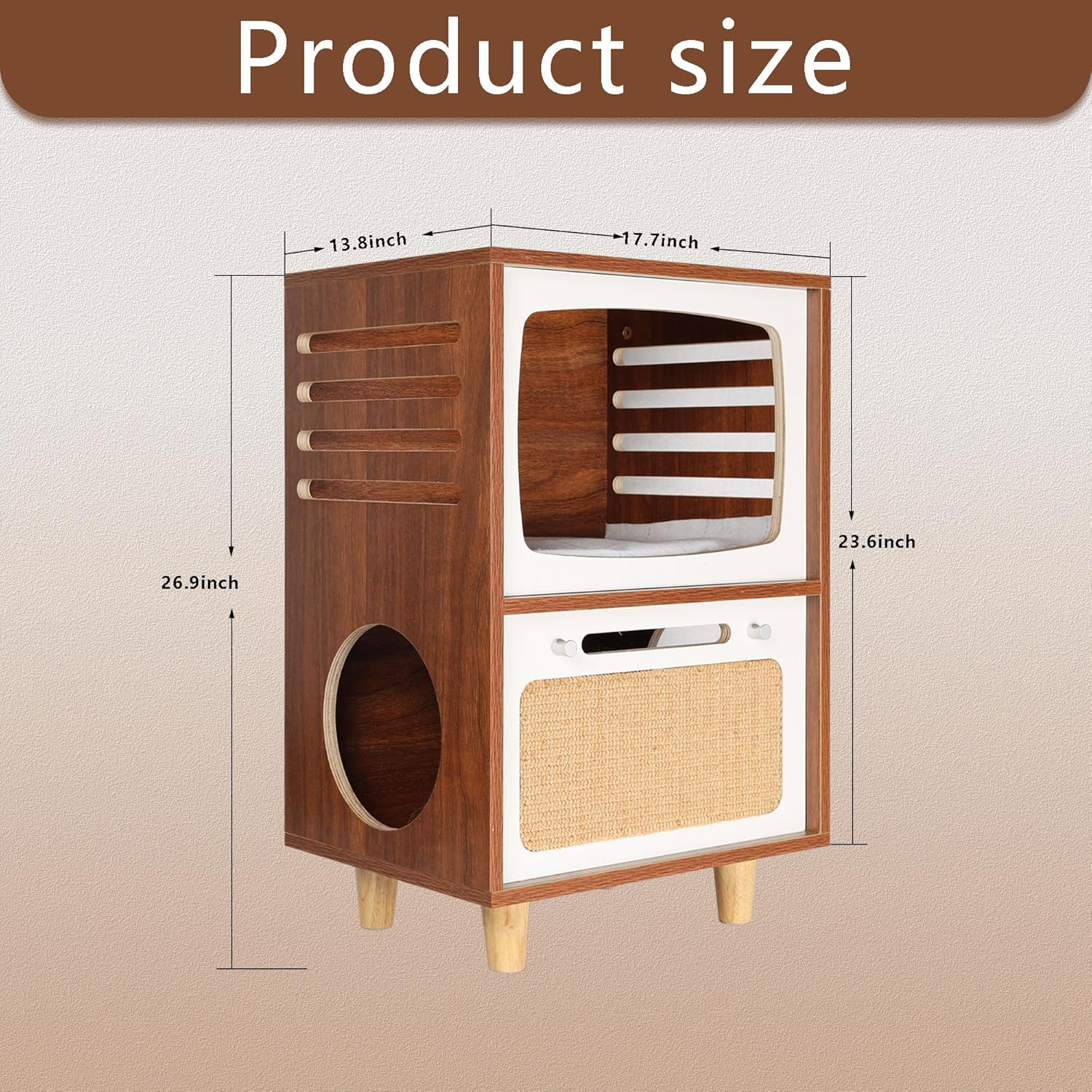 Cat House Side Table, 2-in-1 Wooden Cat House and Bedside Table with Scratching Board – Large Retro TV-Style Two-Tier Indoor Cat Activity Center, Suitable for Indoor Use, Bedside. (Walnut, O)