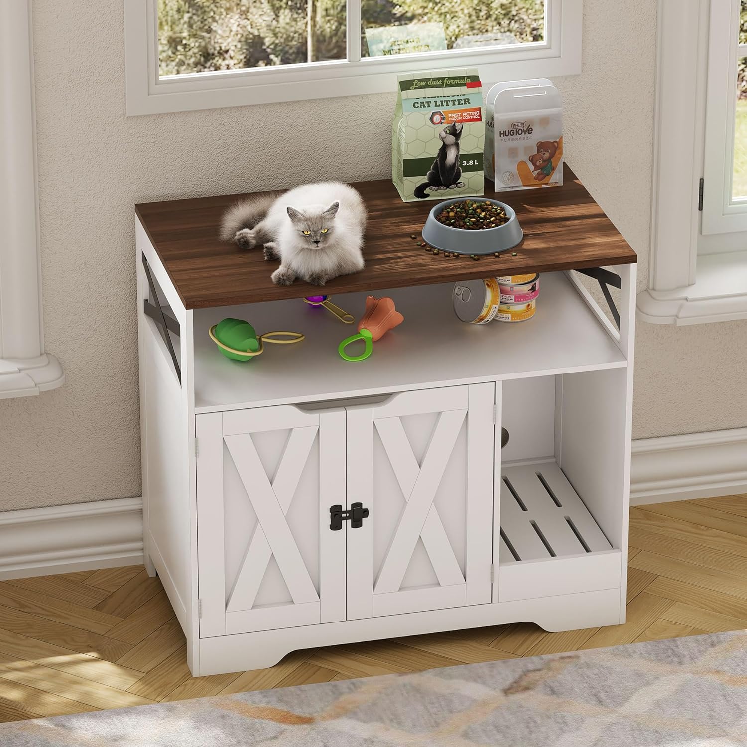 The ZYKZYK Cat Litter Box Enclosure is fantastic! Itâs a stylish 2-in-1 piece that hides the litter box while doubling as a farmhouse-style cabinet. The tall design gives my cat plenty of privacy, and the wooden construction feels sturdy and high-quality. I love the white walnut finishâit blends seamlessly with my living room decor, making the litter box practically invisible. The enclosure is easy to clean, and the open back allows for ventilation and easy access. My cat adjusted quickly, and it keeps everything tidy and odor-contained. A practical and elegant solution for cat owners who want both style and function!