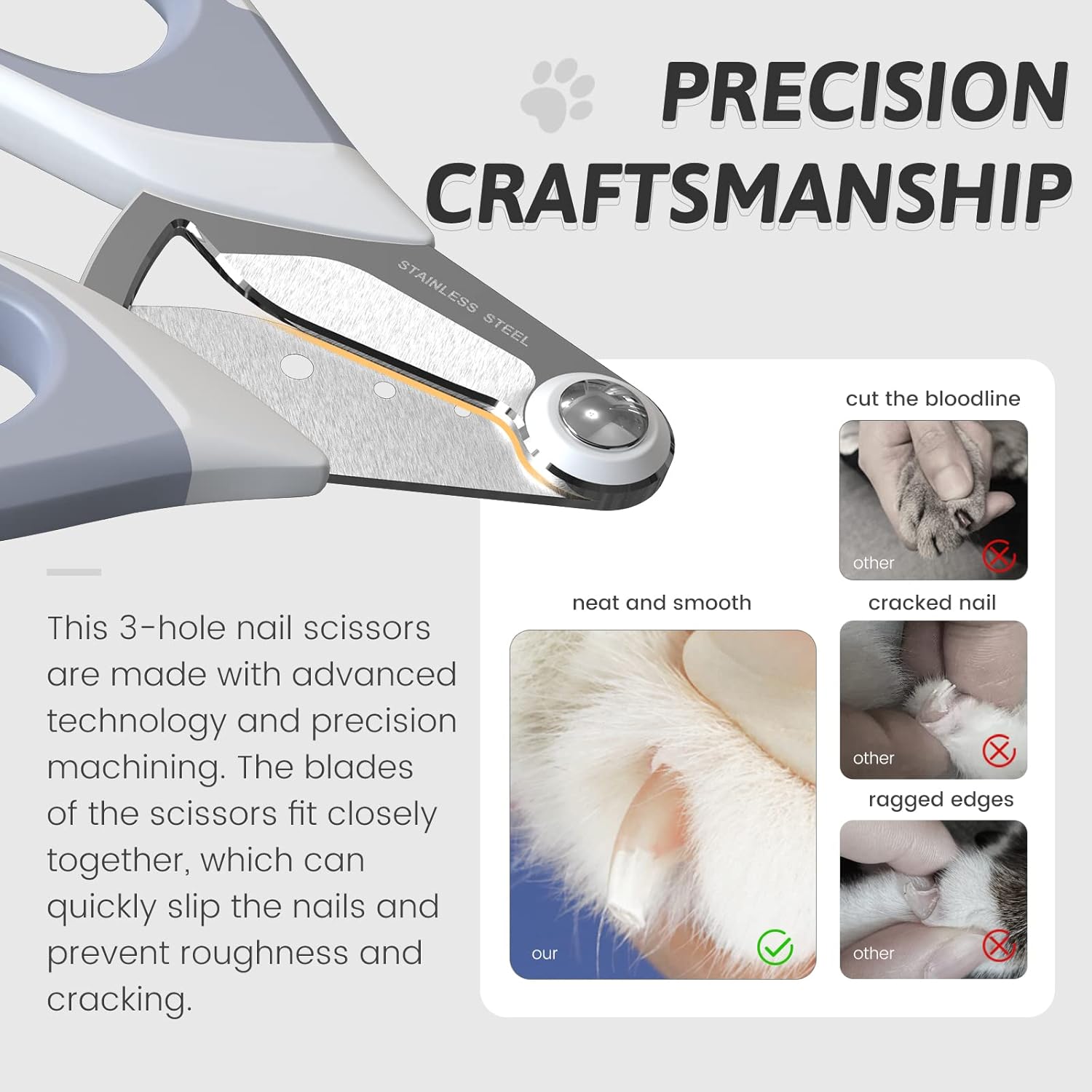 🐱【New Safe Clipper – Protect your Pets 】This new safe 3-holes pet nail clipper is the latest upgrade product. Traditional scissors need to hold pets well and can only complete cliping at a certain angle. But our 3-hole pet nail clippers are cleverly designed to allow you to safely clip at any angle. Just put the nail into the corresponding hole, the nail can be clipped very well without cutting blood line, or avoid over cutting, effectively protect your pets.