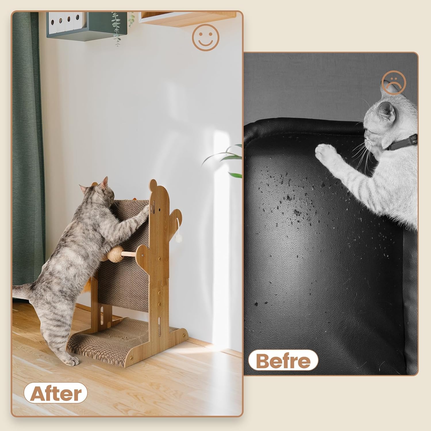 Durable & Eco-Friendly: Built to last with dense corrugated cardboard and a solid wood frame, our T-shaped cat scratch pad is both durable and eco-friendly. The double-sided design makes it cost-effective and long-lasting.