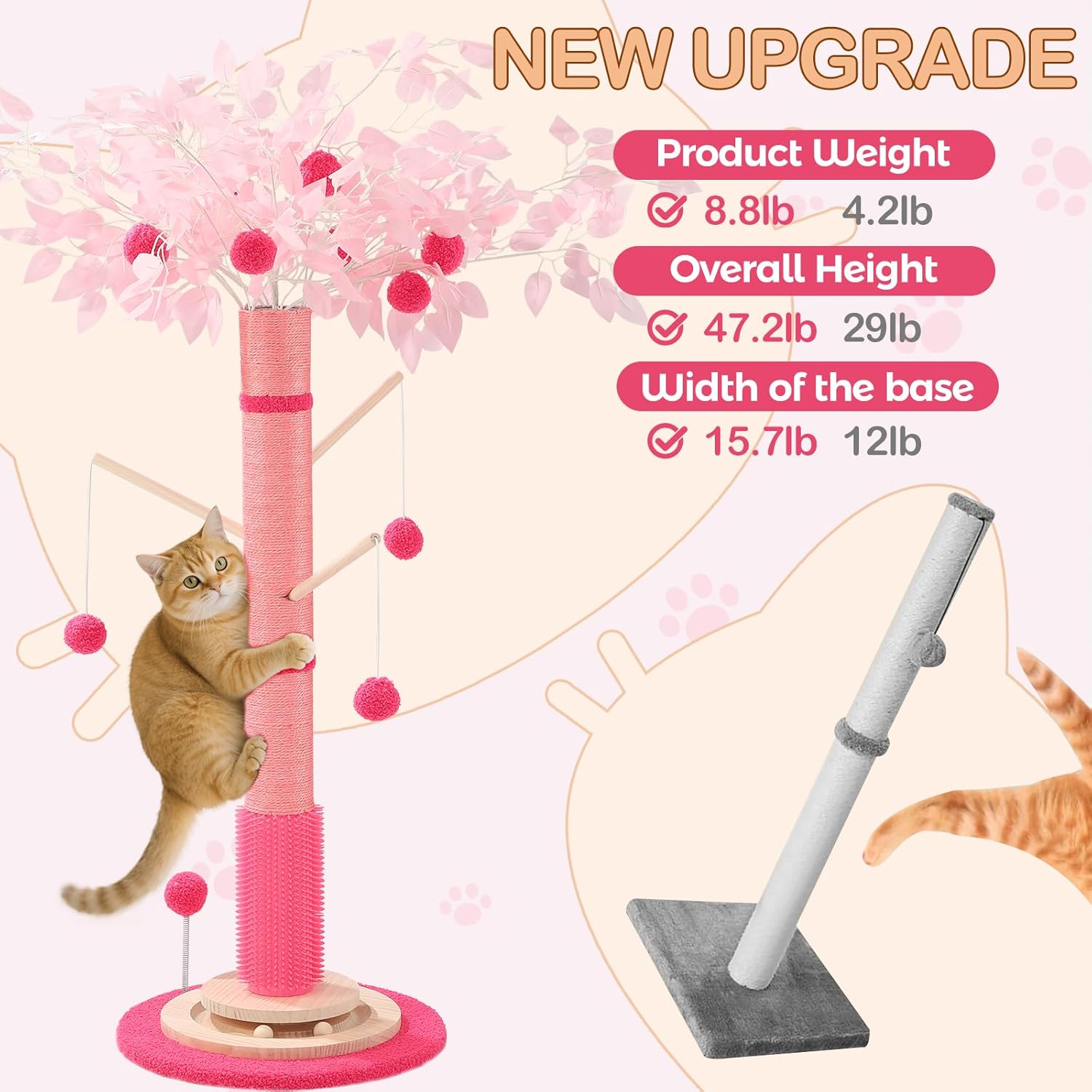 Cat Scratching Post for Indoor Cats Adults, 45 Inch Tall Cat Scratcher with Sisal Rope, Large Cats Scratching Posts with Hanging Ball for Kittens and Medium Large Cats (Pink Color)