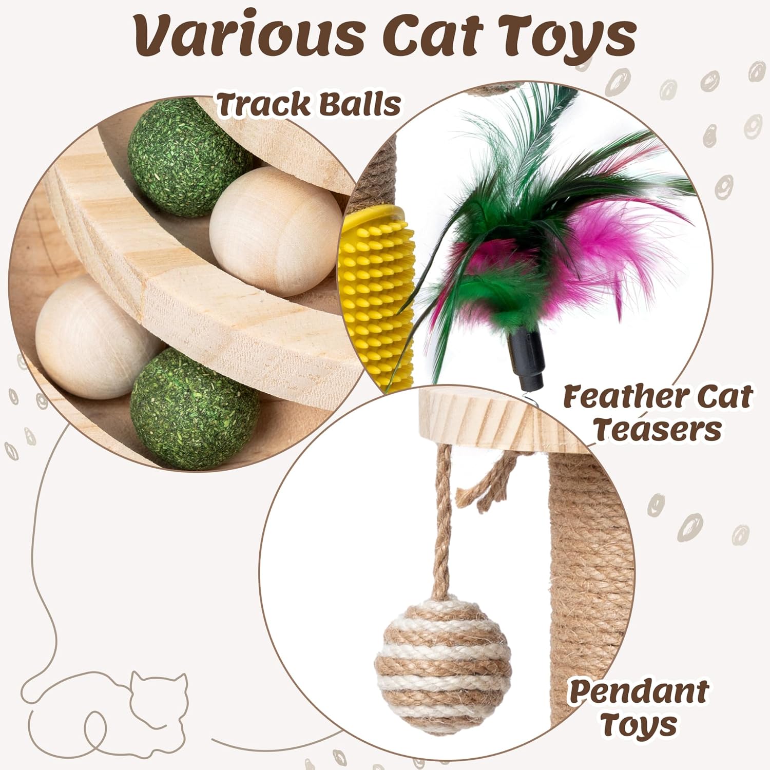 Cat Scratching Post Interactive – 5-in-1 Kitten Scratch Post Self Play Toy, Vertical Scratcher and Self Groomer for Indoor Cats, Small Pet Tree Climbing Tower with Dangling Plush Track Ball