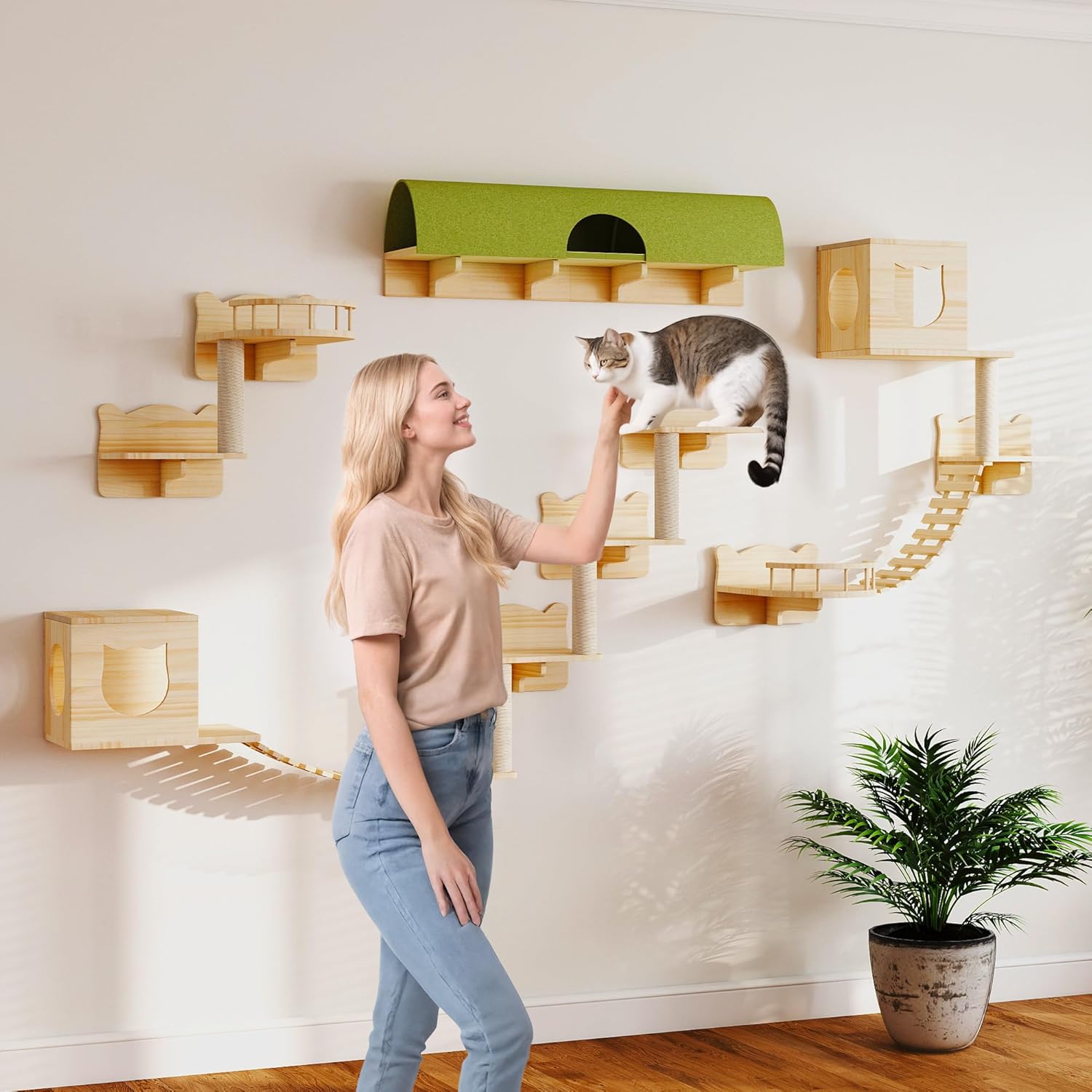 Cat Wall Shelves, Cat Wall Furniture Pine Wooden Feline Shelf, 18 Piece Feline Shelves and Perches with Condos, House, Steps, Bridge Ladder, Scratching Post and Tunnel