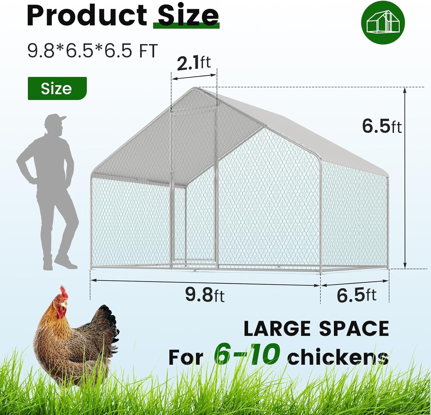 🐤【chicken coops for backyard and Farm】:The 1 room chicken coop size is 9.8′ L×6.5’W× 6.5’H. Featuring a heavy steel frame and full covrage PVC coated wire mesh that is too solid and durable to damage. Lockable steel door with a latch and steel wire ties for extra safety.