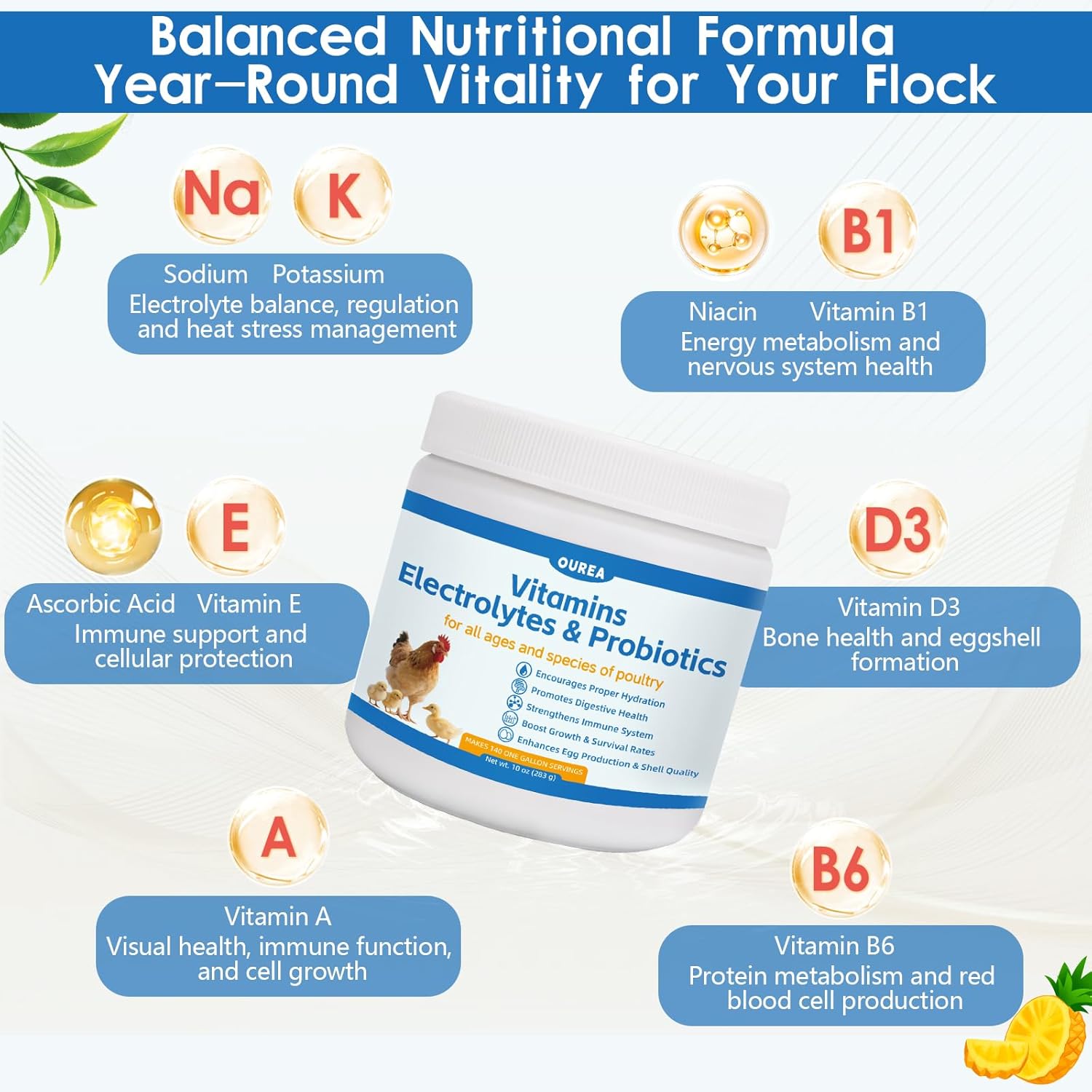 Boost Immunity & Stress Resistance: In the face of environmental changes and disease risks, every chicken needs protection. Ourea formula is rich in essential vitamins A, D, E, and C, probiotics, and poultry electrolytes to strengthen the immune system, help poultry fight off illnesses, and adapt to stress, keeping your flock strong and full of vitality
