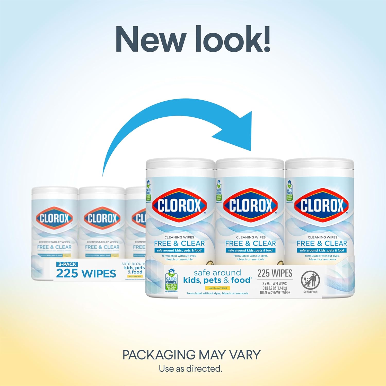 Clorox Free & Clear Cleaning Wipes, Light Lemon Scent, 75 Count, Pack of 3 (Pack May Vary)