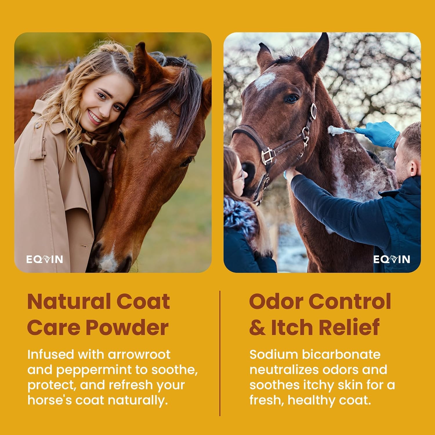 This coat powder for horses is formulated with all natural ingredients, including arrowroot, peppermint oil, sodium baking soda, corn starch and calcium bentonite, all of which have beneficial properties for skin and coat.This is the first powder product Iâve used on my horses, and it has pros and cons. Itâs easy to apply to the horseâs back and hindquarters, but not the legs, neck or belly. It absorbs nicely into the coat with a soft brush, and is left in. It makes the coat soft, and pleasant smelling. It does help remove dirt and stains, but itâs not a miracle, you still have to do a lot brushing! My horses donât have summer skin issues, so Iâm not able to review the efficacy on rainrot or sweet itch, but I would definitely try it if they did, and based on the ingredients it should be effective. Iâve only given it 4 stars due to the limits of application, and associated waste, of a powdered product.
