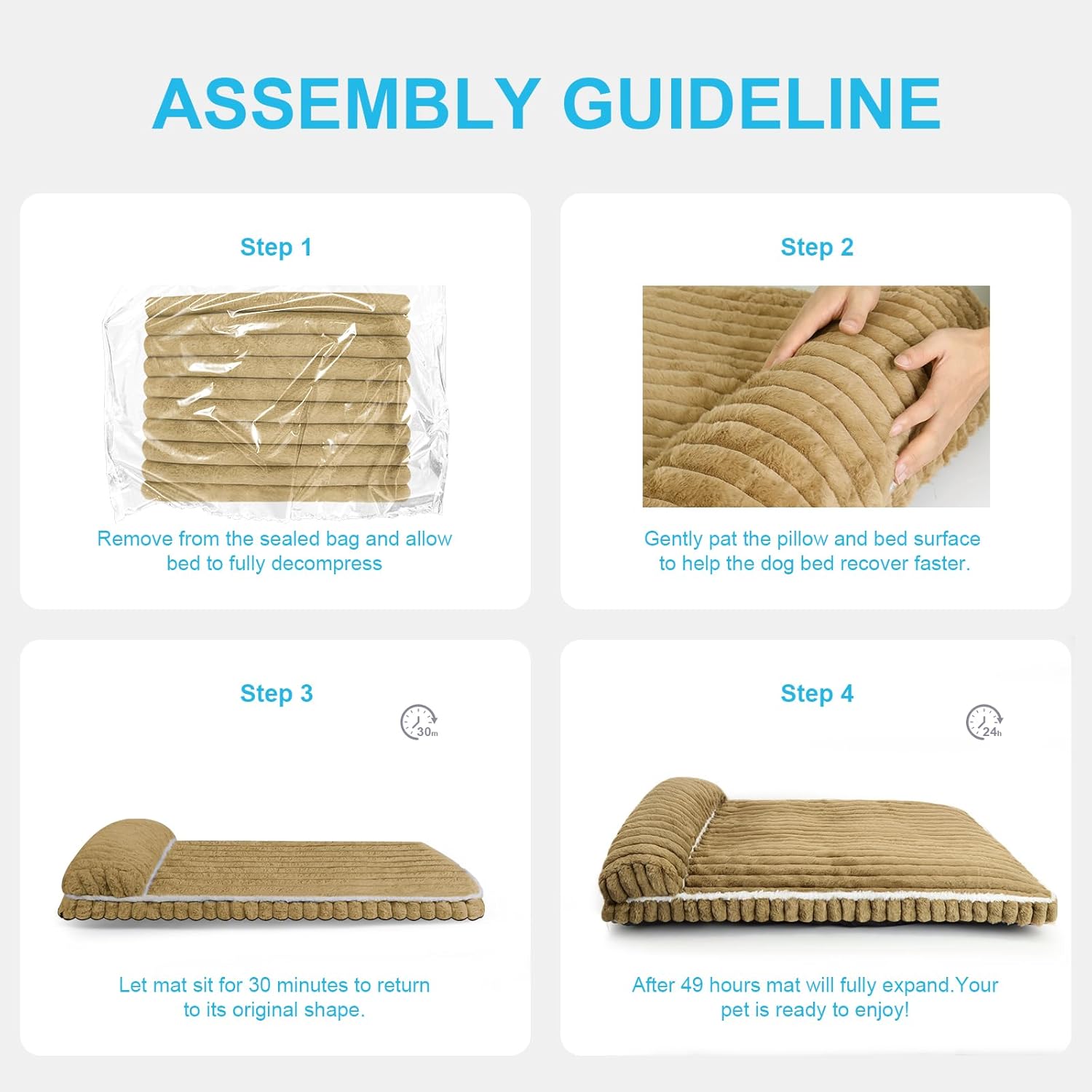 needed to replace my dogs current bed as she was sprayed by a skunk, and got this one. it comes in a box tightly packaged and needs to “breathe” for 24-48 hours so keep that in mind if you are in a bind like me, overall it is soft but not as cushy as pictured. its decent for the price but not as full i would say as it looks. overall happy with it, as is my old lady.