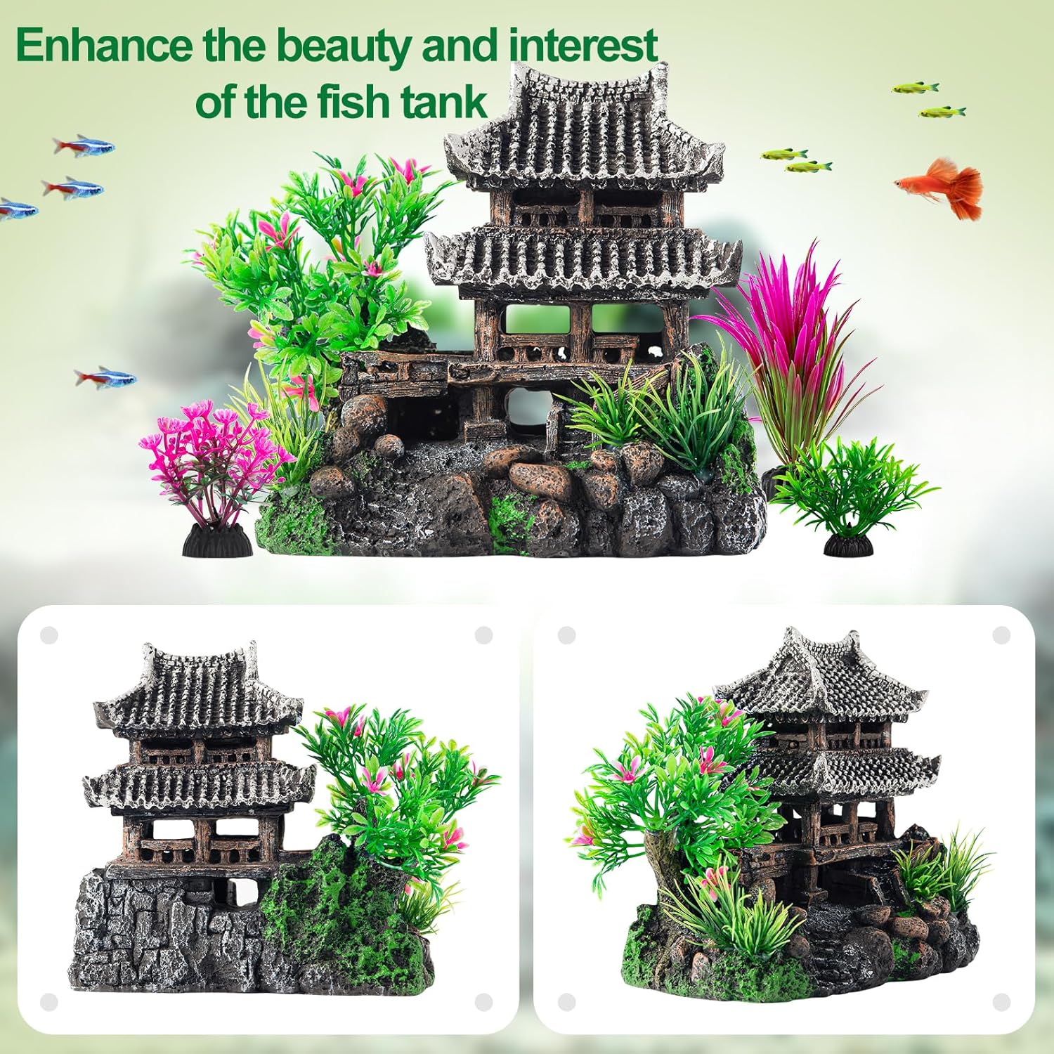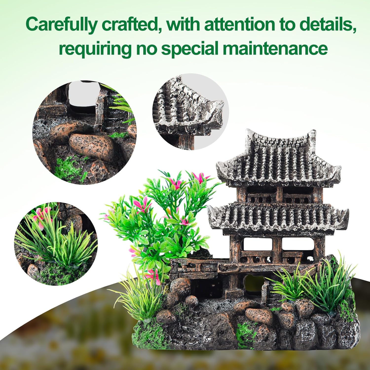 I absolutely love this little pagoda! It looks so beautiful and gives my aquarium a cozy, peaceful atmosphere.The first one arrived with a broken roof â probably got damaged during shipping â but Amazon quickly sent me a replacement. I returned the damaged one, and the new one arrived the next day in perfect condition!The quality is great, and the details are amazing. It looks stunning underwater, especially with the lights and plants around it.Highly recommend it to anyone who wants to add an elegant Asian touch to their tank!