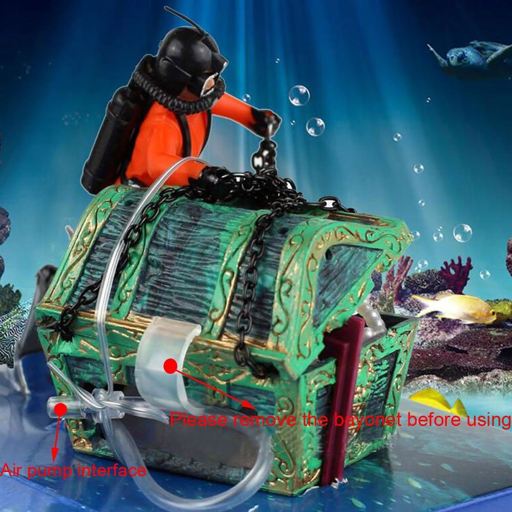 The treasure chest decoration is not bad, perfect size for my 10 gallon tank. I like the bright orange color of the diver. The diver is blobbing up and down due to air bubbles.Two more complaints here :The chest is not heavy, so it kind of floats a little. I put some rocks at the tube behind the chest to weight it down.Another one, the chest doesn’t open and close by itself after state by the seller. I tried, but it either closes or open, but not moving.Over all, it’s just ok. My children likes to look at it, and the chain of the diver is just long enough for our tank.
